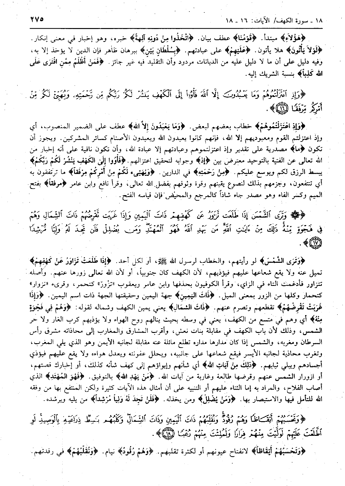 وَتَرَى الشَّمْسَ لو رأيتهم، والخطاب لرسول الله صلّى الله عليه وسلّم، أو لكل أحد. إِذا طَلَعَتْ تَتَزاوَرُ عَنْ كَهْفِهِمْ تميل عنه ولا يقع شعاعها عليهم فيؤذيهم، لأن الكهف كان جنوبياً، أو لأن الله تعالى زورها عنهم. وأصله تتزاور فأدغمت التاء في الزاي، وقرأ الكوفيون بحذفها وابن عامر ويعقوب «تزور» كتحمر، وقرئ «تزوار» كتحمار وكلها من الزور بمعنى الميل. ذاتَ الْيَمِينِ جهة اليمين وحقيقتها الجهة ذات اسم اليمين. وَإِذا غَرَبَتْ تَقْرِضُهُمْ تقطعهم وتصرم عنهم. ذاتَ الشِّمالِ يعني يمين الكهف وشماله لقوله: وَهُمْ فِي فَجْوَةٍ مِنْهُ أي وهم في متسع من الكهف، يعني في وسطه بحيث ينالهم روح الهواء ولا يؤذيهم كرب الغار ولا حر الشمس، وذلك لأن باب الكهف في مقابلة بنات نعش، وأقرب المشارق والمغارب إلى محاذاته مشرق رأس السرطان ومغربه، والشمس إذا كان مدارها مداره تطلع مائلة عنه مقابلة لجانبه الأيمن وهو الذي يلي المغرب، وتغرب محاذية لجانبه الأيسر فيقع شعاعها على جانبيه، ويحلل عفونته ويعدل هواءه ولا يقع عليهم فيؤذي أجسادهم ويبلي ثيابهم. ذلِكَ مِنْ آياتِ اللَّهِ أي شأنهم وإيواؤهم إلى كهف شأنه كذلك، أو إخبارك قصتهم، أو ازورار الشمس عنهم وقرضها طالعة وغاربة من آيات الله. مَنْ يَهْدِ اللَّهُ بالتوفيق. فَهُوَ الْمُهْتَدِ الذي أصاب الفلاح، والمراد به إما الثناء عليهم أو التنبيه على أن أمثال هذه الآيات كثيرة ولكن المنتفع بها من وفقه الله للتأمل فيها والاستبصار بها. وَمَنْ يُضْلِلْ ومن يخذله. فَلَنْ تَجِدَ لَهُ وَلِيًّا مُرْشِداً من يليه ويرشده.