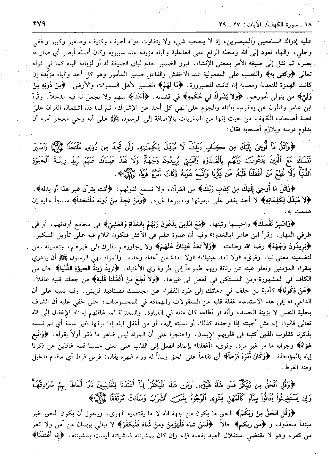 وَاتْلُ مَا أُوحِيَ إِلَيْكَ مِنْ كِتابِ رَبِّكَ لا مُبَدِّلَ لِكَلِماتِهِ وَلَنْ تَجِدَ مِنْ دُونِهِ مُلْتَحَداً (27) وَاصْبِرْ نَفْسَكَ مَعَ الَّذِينَ يَدْعُونَ رَبَّهُمْ بِالْغَداةِ وَالْعَشِيِّ يُرِيدُونَ وَجْهَهُ وَلا تَعْدُ عَيْناكَ عَنْهُمْ تُرِيدُ زِينَةَ الْحَياةِ الدُّنْيا وَلا تُطِعْ مَنْ أَغْفَلْنا قَلْبَهُ عَنْ ذِكْرِنا وَاتَّبَعَ هَواهُ وَكانَ أَمْرُهُ فُرُطاً (28)
