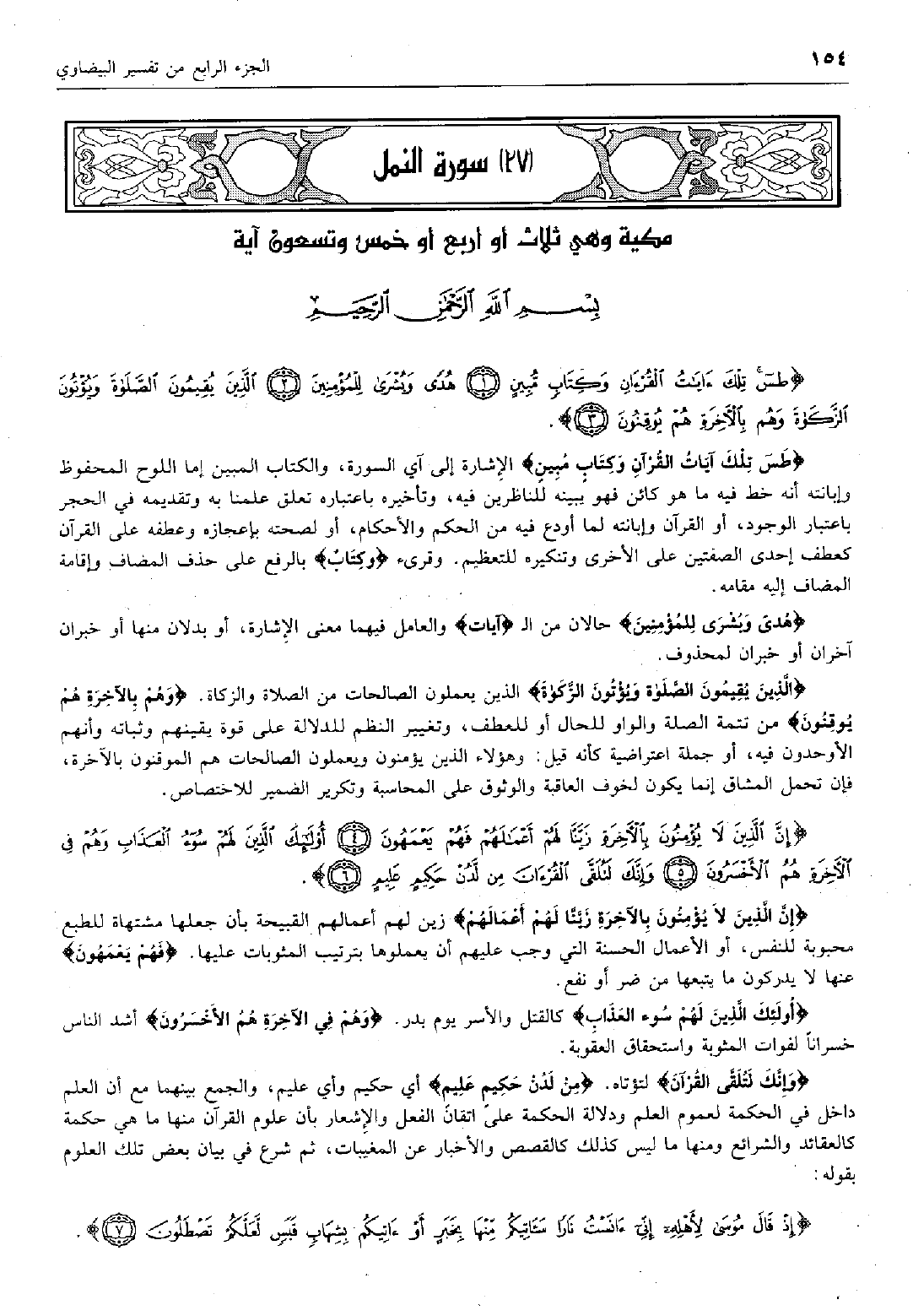 طس تِلْكَ آياتُ الْقُرْآنِ وَكِتابٍ مُبِينٍ (1) هُدىً وَبُشْرى لِلْمُؤْمِنِينَ (2) الَّذِينَ يُقِيمُونَ الصَّلاةَ وَيُؤْتُونَ الزَّكاةَ وَهُمْ بِالْآخِرَةِ هُمْ يُوقِنُونَ (3)