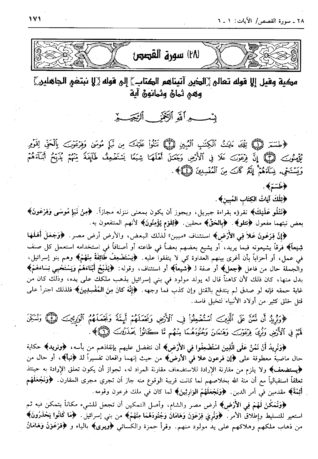 طسم (1) تِلْكَ آياتُ الْكِتابِ الْمُبِينِ (2) نَتْلُوا عَلَيْكَ مِنْ نَبَإِ مُوسى وَفِرْعَوْنَ بِالْحَقِّ لِقَوْمٍ يُؤْمِنُونَ (3) إِنَّ فِرْعَوْنَ عَلا فِي الْأَرْضِ وَجَعَلَ أَهْلَها شِيَعاً يَسْتَضْعِفُ طائِفَةً مِنْهُمْ يُذَبِّحُ أَبْناءَهُمْ وَيَسْتَحْيِي نِساءَهُمْ إِنَّهُ كانَ مِنَ الْمُفْسِدِينَ (4)