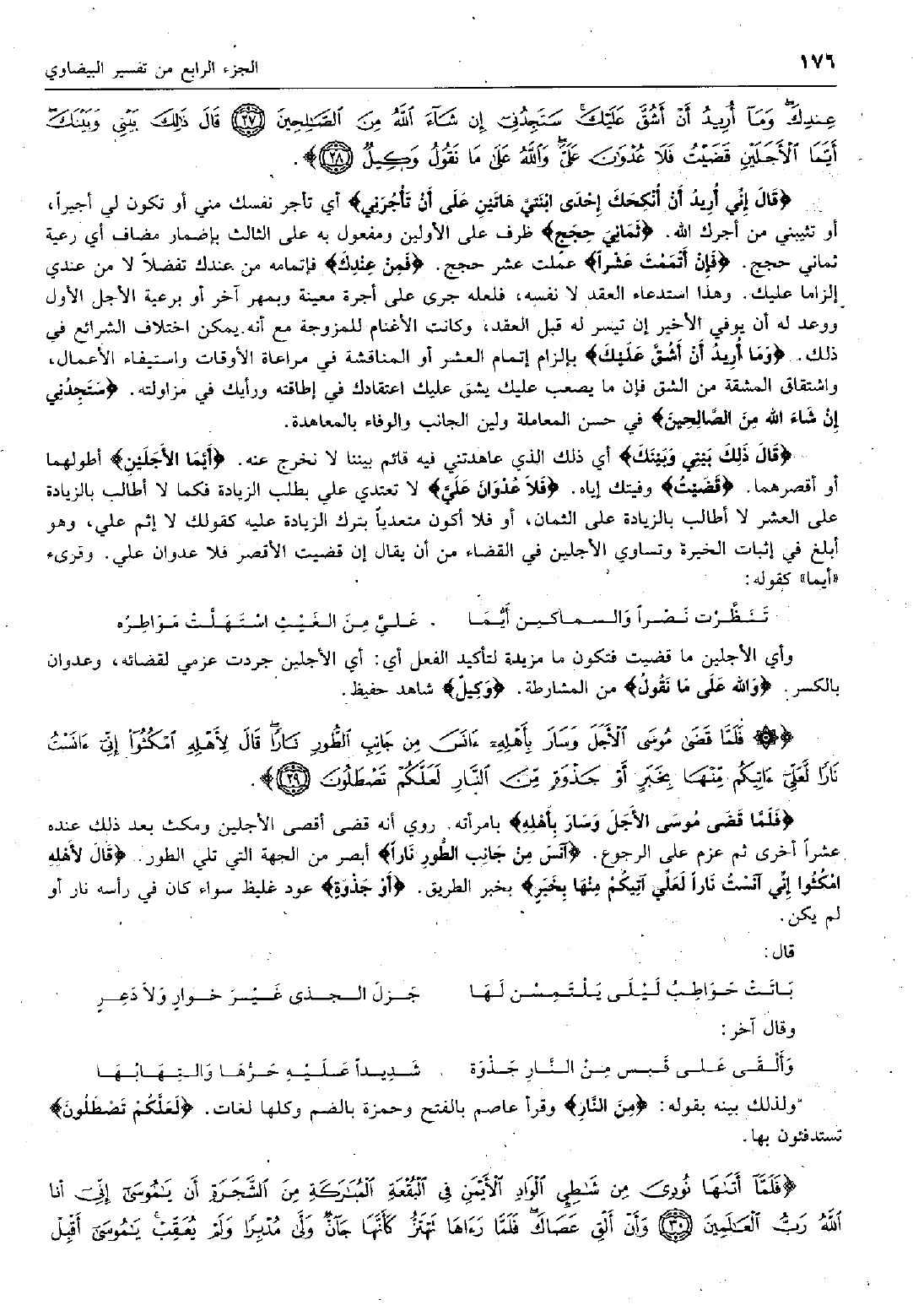 قالَ ذلِكَ بَيْنِي وَبَيْنَكَ أي ذلك الذي عاهدتني فيه قائم بيننا لا نخرج عنه. أَيَّمَا الْأَجَلَيْنِ أطولهما أو أقصرهما. قَضَيْتُ وفيتك إياه. فَلا عُدْوانَ عَلَيَّ لا تعتدي علي بطلب الزيادة فكما لا أطالب بالزيادة على العشر لا أطالب بالزيادة على الثمان، أو فلا أكون متعدياً بترك الزيادة عليه كقولك لا إثم علي، وهو أبلغ في إثبات الخيرة وتساوي الأجلين في القضاء من أن يقال إن قضيت الأقصر فلا عدوان علي. وقرئ «أَيَّمَا» كقوله: