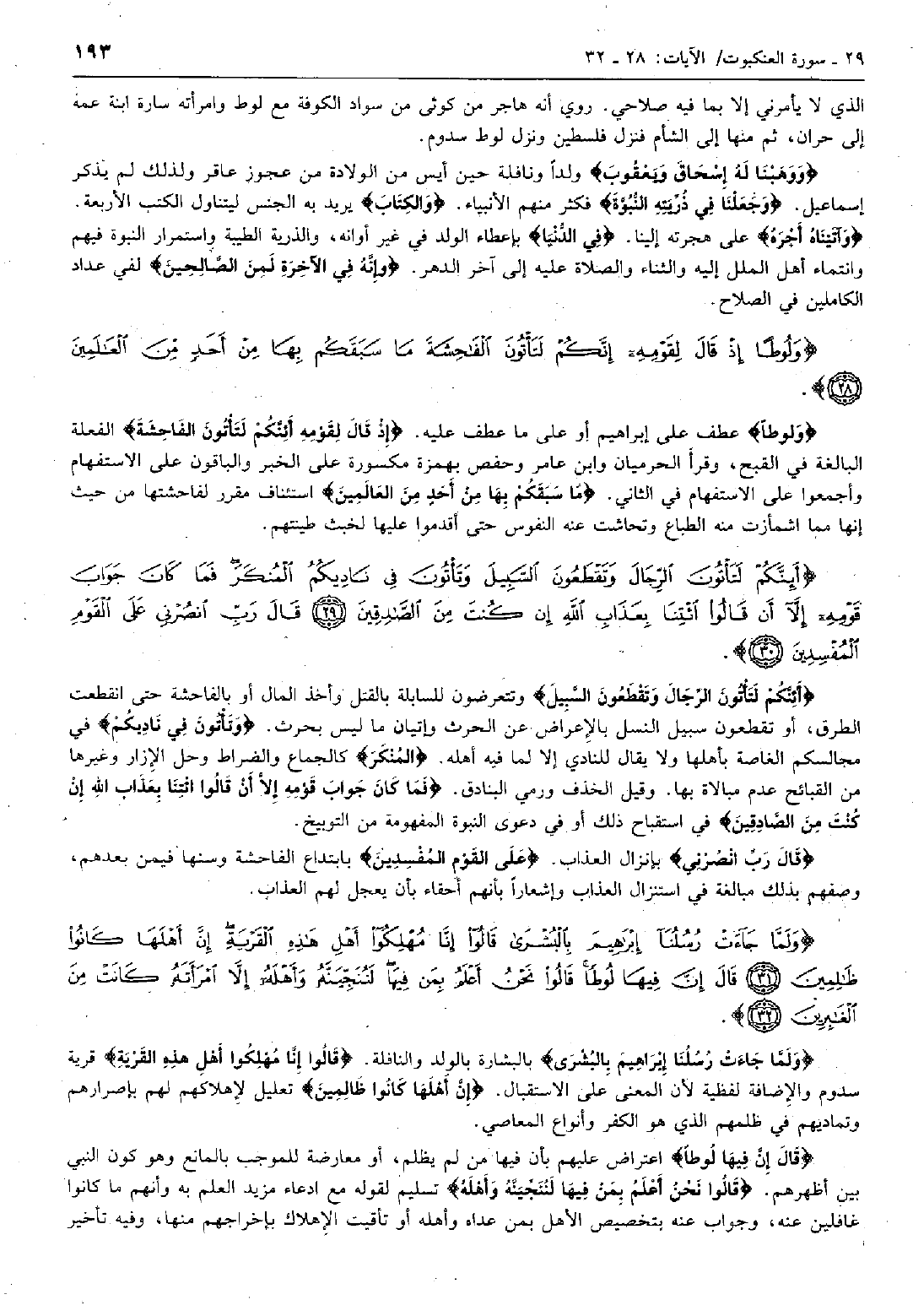 وَلَمَّا جاءَتْ رُسُلُنا إِبْراهِيمَ بِالْبُشْرى قالُوا إِنَّا مُهْلِكُوا أَهْلِ هذِهِ الْقَرْيَةِ إِنَّ أَهْلَها كانُوا ظالِمِينَ (31) قالَ إِنَّ فِيها لُوطاً قالُوا نَحْنُ أَعْلَمُ بِمَنْ فِيها لَنُنَجِّيَنَّهُ وَأَهْلَهُ إِلاَّ امْرَأَتَهُ كانَتْ مِنَ الْغابِرِينَ (32)