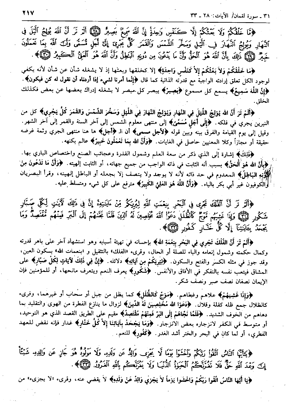 مَّا خَلْقُكُمْ وَلا بَعْثُكُمْ إِلاَّ كَنَفْسٍ واحِدَةٍ إِنَّ اللَّهَ سَمِيعٌ بَصِيرٌ (28) أَلَمْ تَرَ أَنَّ اللَّهَ يُولِجُ اللَّيْلَ فِي النَّهارِ وَيُولِجُ النَّهارَ فِي اللَّيْلِ وَسَخَّرَ الشَّمْسَ وَالْقَمَرَ كُلٌّ يَجْرِي إِلى أَجَلٍ مُسَمًّى وَأَنَّ اللَّهَ بِما تَعْمَلُونَ خَبِيرٌ (29) ذلِكَ بِأَنَّ اللَّهَ هُوَ الْحَقُّ وَأَنَّ مَا يَدْعُونَ مِنْ دُونِهِ الْباطِلُ وَأَنَّ اللَّهَ هُوَ الْعَلِيُّ الْكَبِيرُ (30)