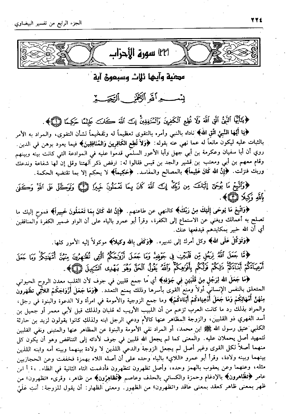 مَّا جَعَلَ اللَّهُ لِرَجُلٍ مِنْ قَلْبَيْنِ فِي جَوْفِهِ وَما جَعَلَ أَزْواجَكُمُ اللاَّئِي تُظاهِرُونَ مِنْهُنَّ أُمَّهاتِكُمْ وَما جَعَلَ أَدْعِياءَكُمْ أَبْناءَكُمْ ذلِكُمْ قَوْلُكُمْ بِأَفْواهِكُمْ وَاللَّهُ يَقُولُ الْحَقَّ وَهُوَ يَهْدِي السَّبِيلَ (4)