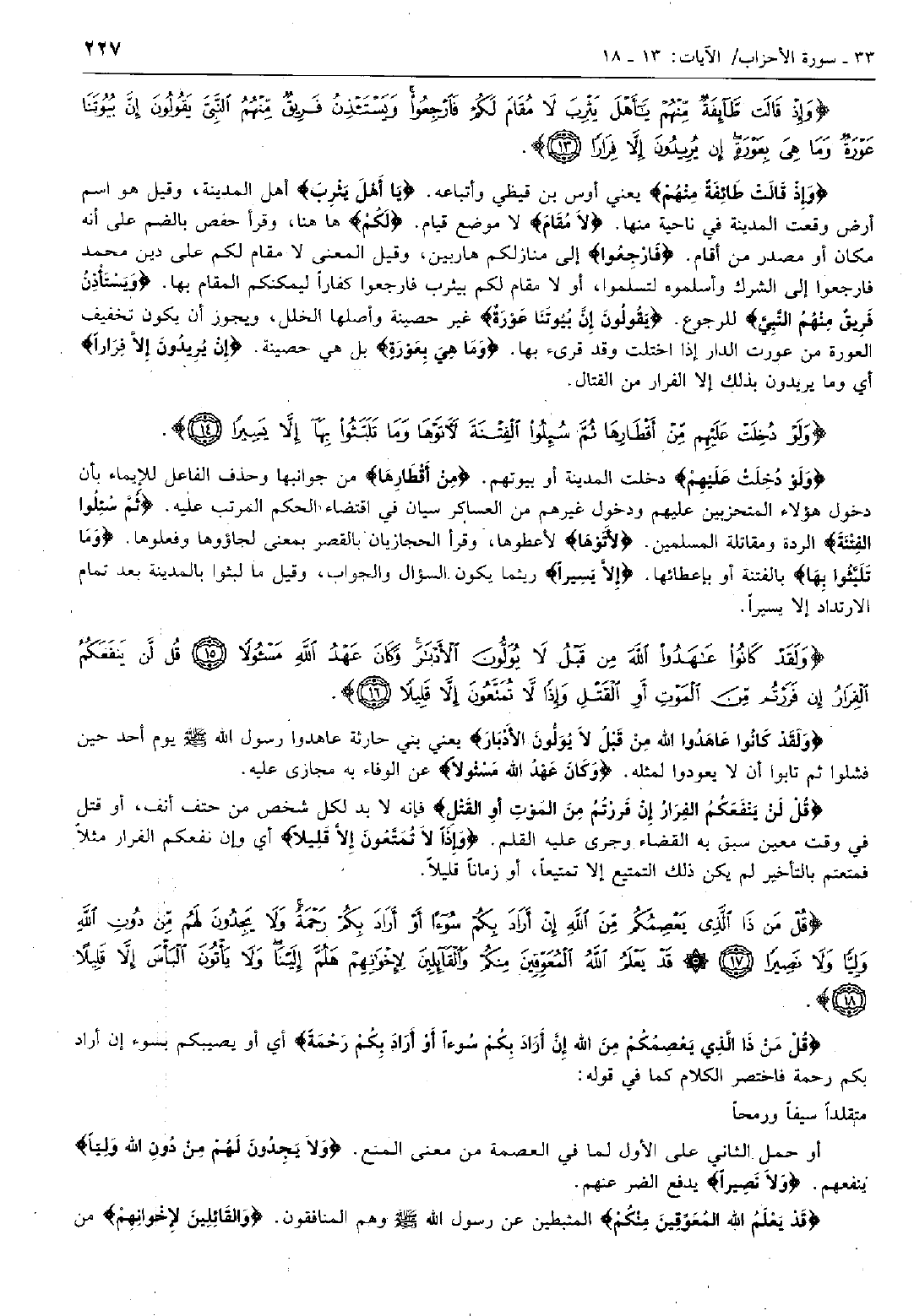 وَإِذْ قالَتْ طائِفَةٌ مِنْهُمْ يا أَهْلَ يَثْرِبَ لا مُقامَ لَكُمْ فَارْجِعُوا وَيَسْتَأْذِنُ فَرِيقٌ مِنْهُمُ النَّبِيَّ يَقُولُونَ إِنَّ بُيُوتَنا عَوْرَةٌ وَما هِيَ بِعَوْرَةٍ إِنْ يُرِيدُونَ إِلاَّ فِراراً (13)