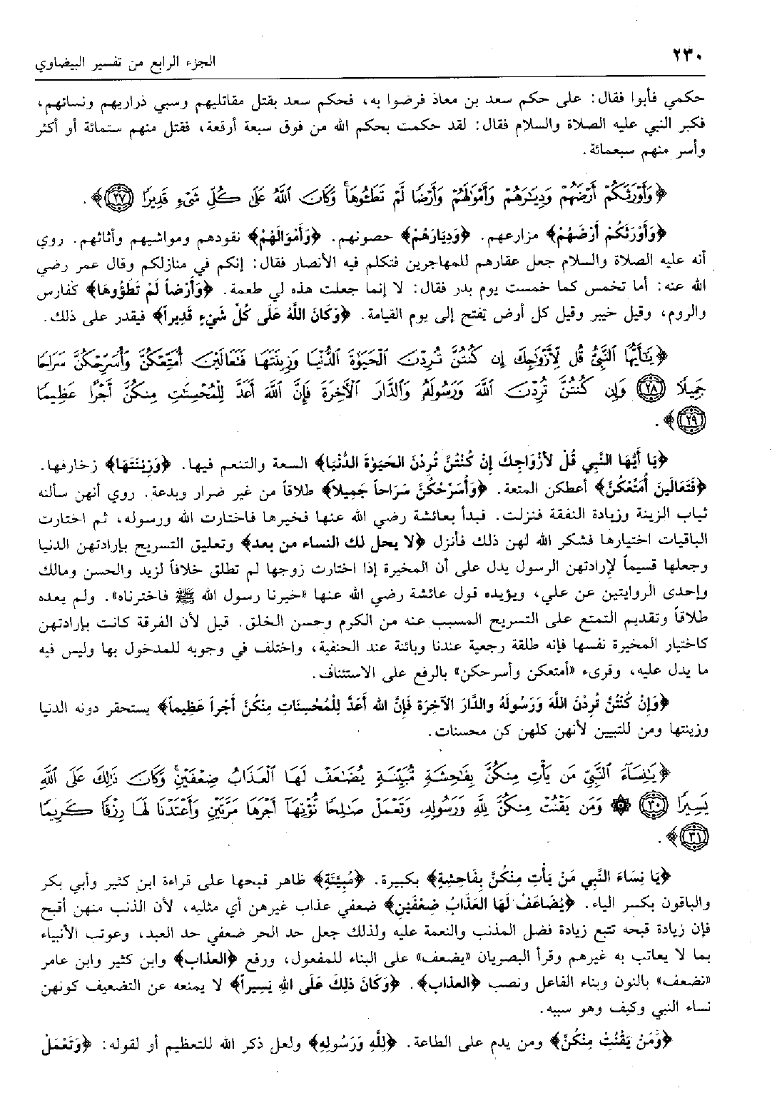 يا أَيُّهَا النَّبِيُّ قُلْ لِأَزْواجِكَ إِنْ كُنْتُنَّ تُرِدْنَ الْحَياةَ الدُّنْيا وَزِينَتَها فَتَعالَيْنَ أُمَتِّعْكُنَّ وَأُسَرِّحْكُنَّ سَراحاً جَمِيلاً (28) وَإِنْ كُنْتُنَّ تُرِدْنَ اللَّهَ وَرَسُولَهُ وَالدَّارَ الْآخِرَةَ فَإِنَّ اللَّهَ أَعَدَّ لِلْمُحْسِناتِ مِنْكُنَّ أَجْراً عَظِيماً (29)
