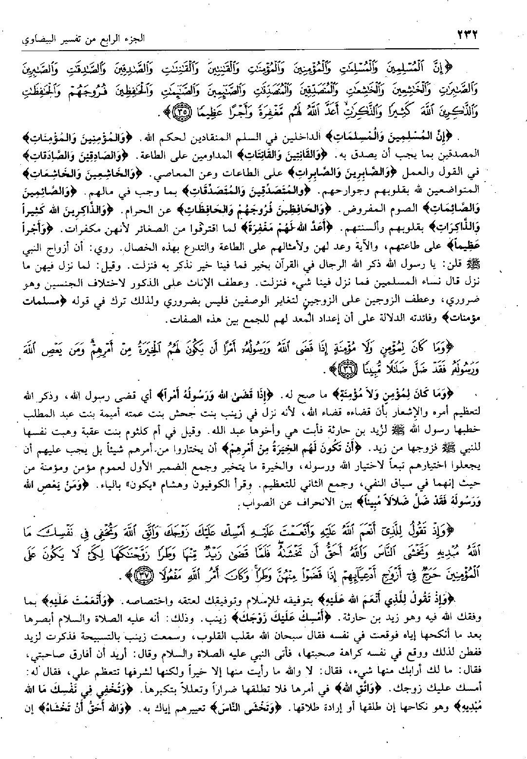 وَإِذْ تَقُولُ لِلَّذِي أَنْعَمَ اللَّهُ عَلَيْهِ وَأَنْعَمْتَ عَلَيْهِ أَمْسِكْ عَلَيْكَ زَوْجَكَ وَاتَّقِ اللَّهَ وَتُخْفِي فِي نَفْسِكَ مَا اللَّهُ مُبْدِيهِ وَتَخْشَى النَّاسَ وَاللَّهُ أَحَقُّ أَنْ تَخْشاهُ فَلَمَّا قَضى زَيْدٌ مِنْها وَطَراً زَوَّجْناكَها لِكَيْ لا يَكُونَ عَلَى الْمُؤْمِنِينَ حَرَجٌ فِي أَزْواجِ أَدْعِيائِهِمْ إِذا قَضَوْا مِنْهُنَّ وَطَراً وَكانَ أَمْرُ اللَّهِ مَفْعُولاً (37)