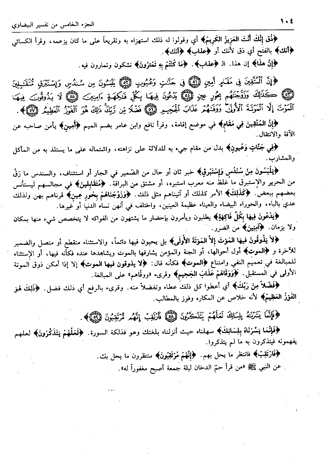 إِنَّ الْمُتَّقِينَ فِي مَقامٍ أَمِينٍ (51) فِي جَنَّاتٍ وَعُيُونٍ (52) يَلْبَسُونَ مِنْ سُندُسٍ وَإِسْتَبْرَقٍ مُتَقابِلِينَ (53) كَذلِكَ وَزَوَّجْناهُمْ بِحُورٍ عِينٍ (54) يَدْعُونَ فِيها بِكُلِّ فاكِهَةٍ آمِنِينَ (55)