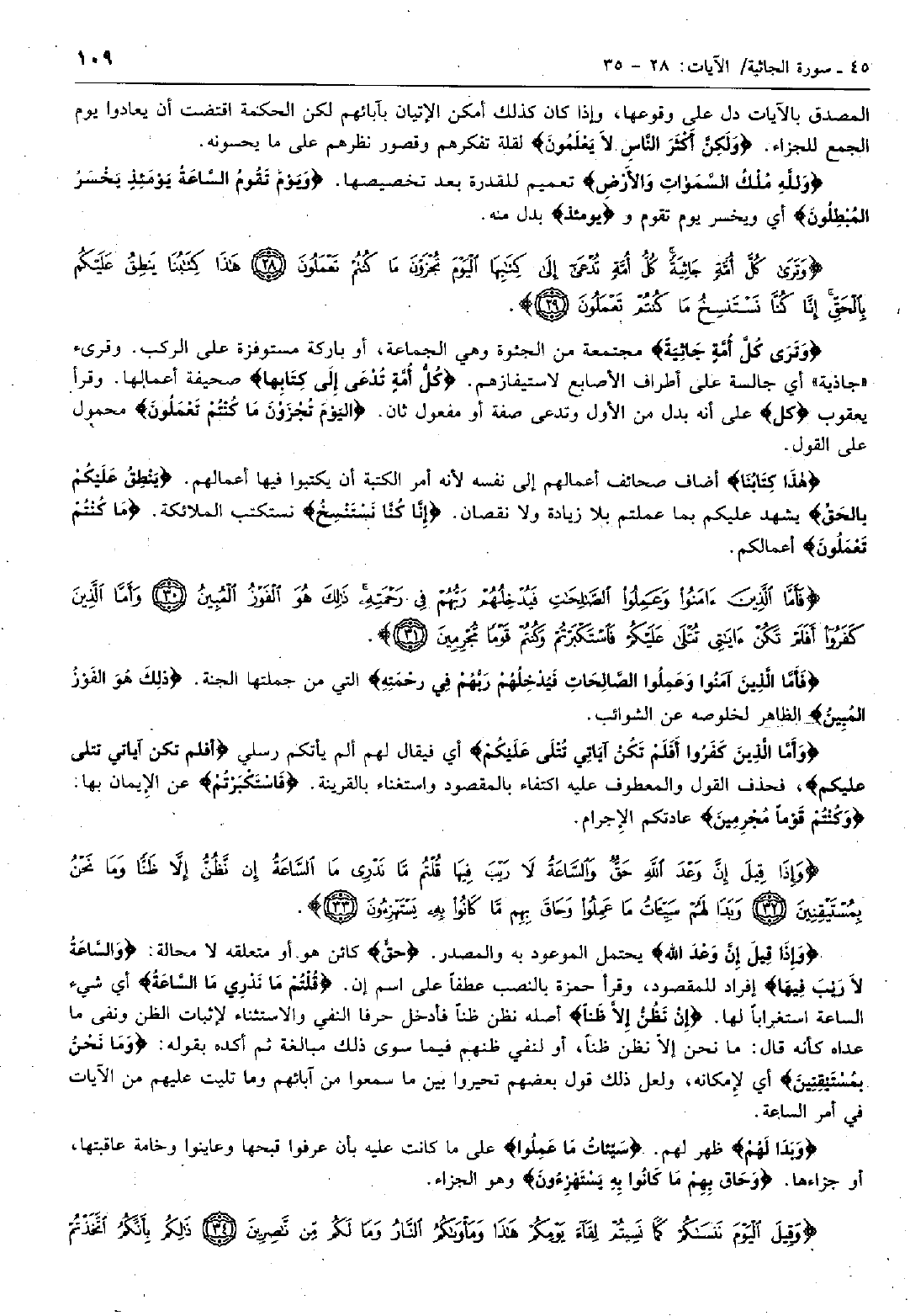 وَتَرى كُلَّ أُمَّةٍ جاثِيَةً كُلُّ أُمَّةٍ تُدْعى إِلى كِتابِهَا الْيَوْمَ تُجْزَوْنَ مَا كُنْتُمْ تَعْمَلُونَ (28) هذا كِتابُنا يَنْطِقُ عَلَيْكُمْ بِالْحَقِّ إِنَّا كُنَّا نَسْتَنْسِخُ ما كُنْتُمْ تَعْمَلُونَ (29)