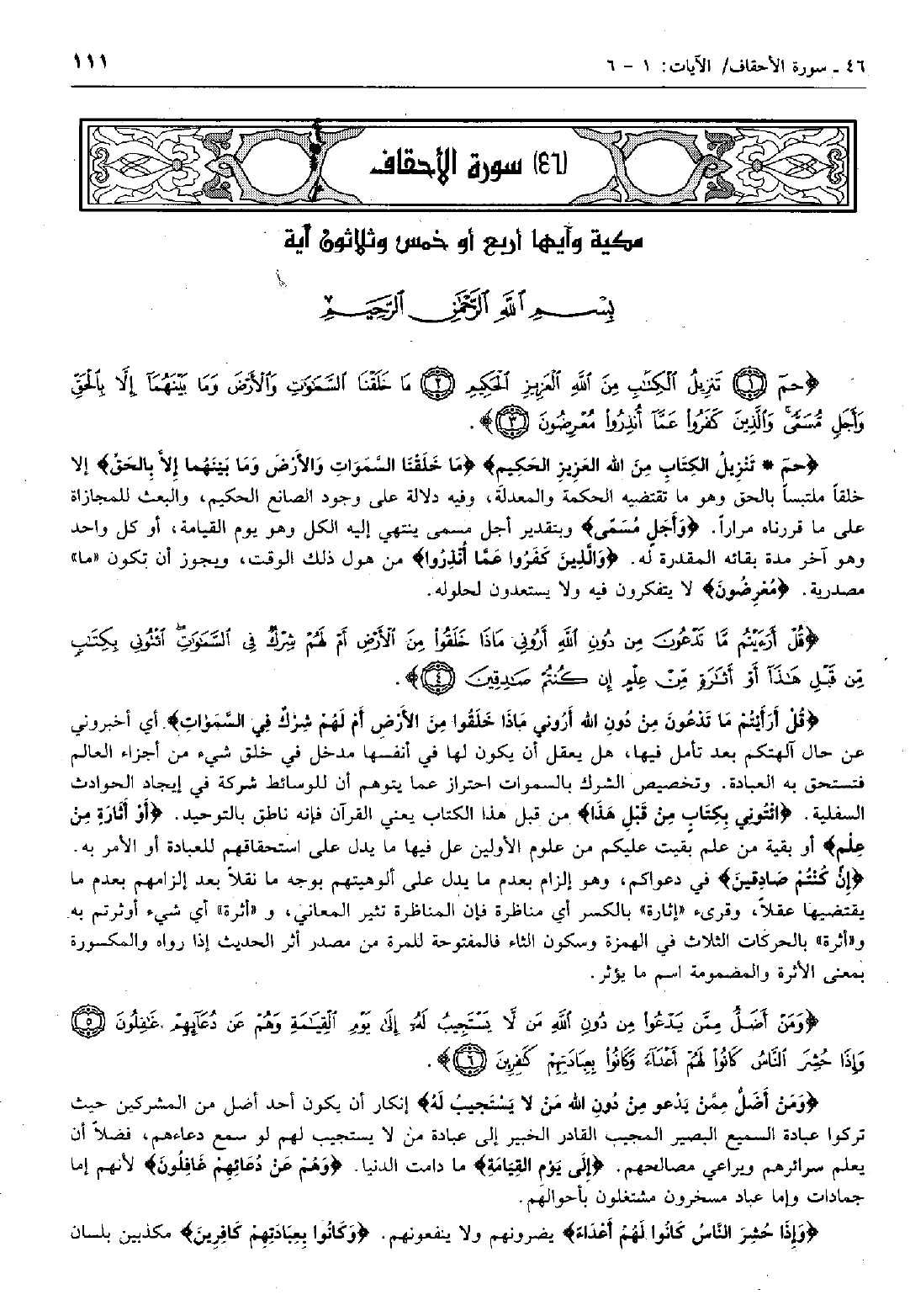 حم (1) تَنْزِيلُ الْكِتابِ مِنَ اللَّهِ الْعَزِيزِ الْحَكِيمِ (2) مَا خَلَقْنَا السَّماواتِ وَالْأَرْضَ وَما بَيْنَهُما إِلاَّ بِالْحَقِّ وَأَجَلٍ مُسَمًّى وَالَّذِينَ كَفَرُوا عَمَّا أُنْذِرُوا مُعْرِضُونَ (3)