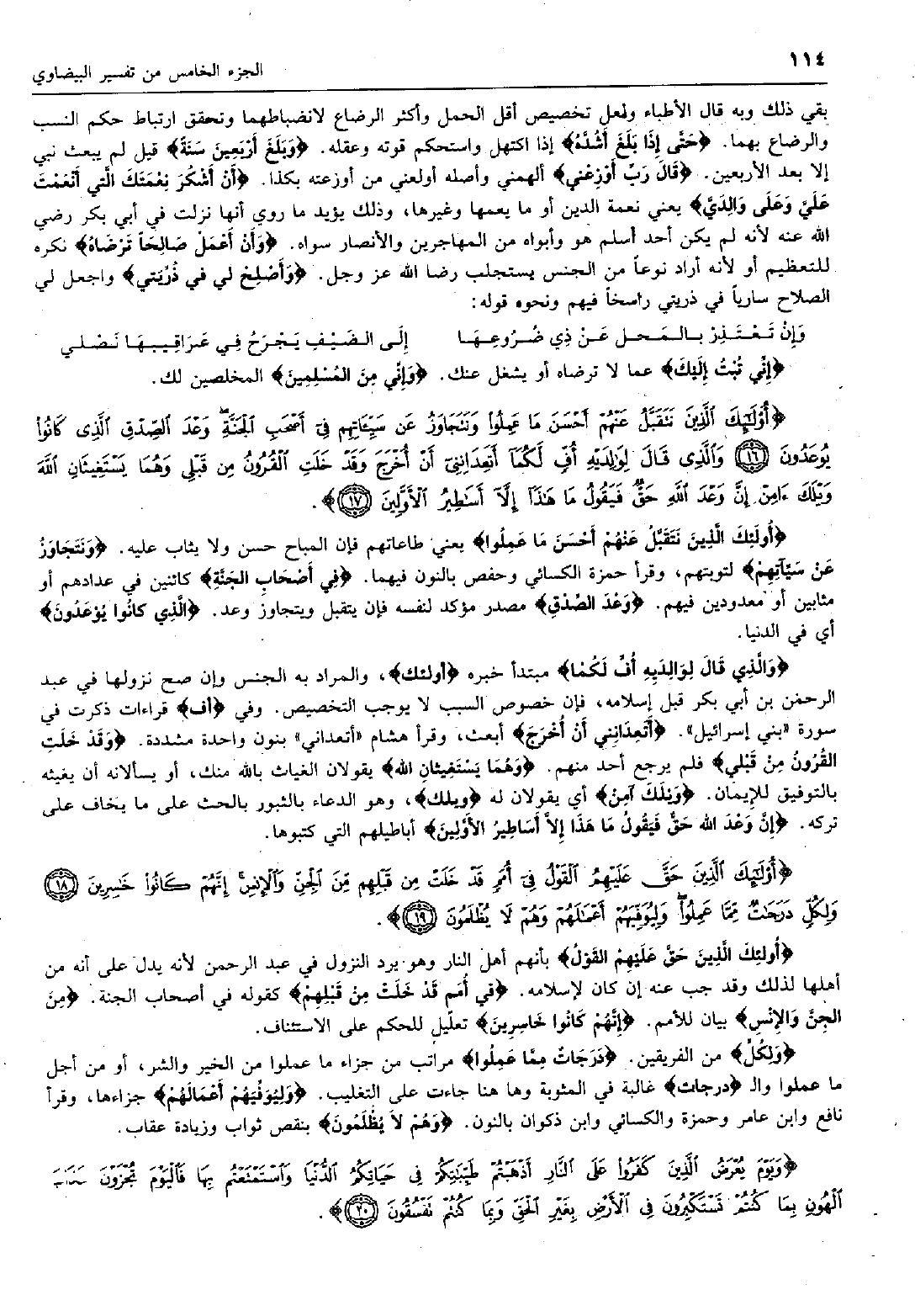 بقي ذلك وبه قال الأطباء ولعل تخصيص أقل الحمل وأكثر الرضاع لانضباطهما وتحقق ارتباط حكم النسب والرضاع بهما. حَتَّى إِذا بَلَغَ أَشُدَّهُ إذا اكتهل واستحكم قوته وعقله. وَبَلَغَ أَرْبَعِينَ سَنَةً قيل لم يبعث نبي إلا بعد الأربعين. قالَ رَبِّ أَوْزِعْنِي ألهمني وأصله أولعني من أوزعته بكذا. أَنْ أَشْكُرَ نِعْمَتَكَ الَّتِي أَنْعَمْتَ عَلَيَّ وَعَلى والِدَيَّ يعني نعمة الدين أو ما يعمها وغيرها، وذلك يؤيد ما روي أنها نزلت في أبي بكر رضي الله عنه لأنه لم يكن أحد أسلم هو وأبواه من المهاجرين والأنصار سواه. وَأَنْ أَعْمَلَ صالِحاً تَرْضاهُ نكرة للتعظيم أو لأنه أراد نوعاً من الجنس يستجلب رضا الله عز وجل. وَأَصْلِحْ لِي فِي ذُرِّيَّتِي واجعل لي الصلاح سارياً في ذريتي راسخاً فيهم ونحوه قوله: