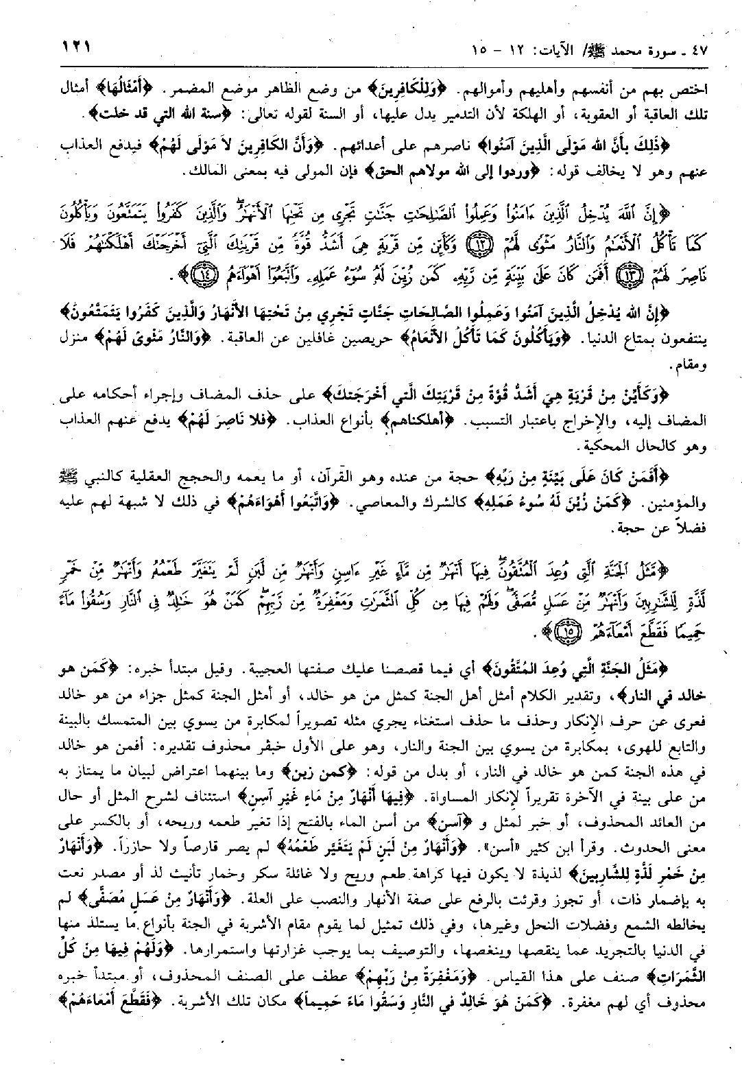 مَثَلُ الْجَنَّةِ الَّتِي وُعِدَ الْمُتَّقُونَ فِيها أَنْهارٌ مِنْ ماءٍ غَيْرِ آسِنٍ وَأَنْهارٌ مِنْ لَبَنٍ لَمْ يَتَغَيَّرْ طَعْمُهُ وَأَنْهارٌ مِنْ خَمْرٍ لَذَّةٍ لِلشَّارِبِينَ وَأَنْهارٌ مِنْ عَسَلٍ مُصَفًّى وَلَهُمْ فِيها مِنْ كُلِّ الثَّمَراتِ وَمَغْفِرَةٌ مِنْ رَبِّهِمْ كَمَنْ هُوَ خالِدٌ فِي النَّارِ وَسُقُوا مَاءً حَمِيماً فَقَطَّعَ أَمْعاءَهُمْ (15)