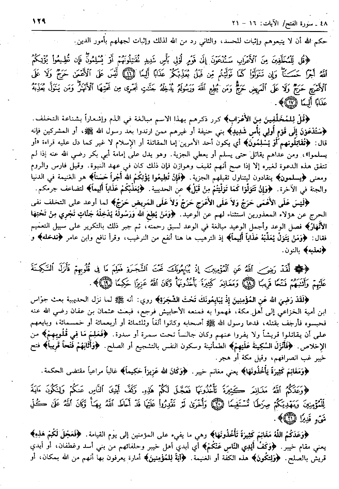 قُلْ لِلْمُخَلَّفِينَ مِنَ الْأَعْرابِ سَتُدْعَوْنَ إِلى قَوْمٍ أُولِي بَأْسٍ شَدِيدٍ تُقاتِلُونَهُمْ أَوْ يُسْلِمُونَ فَإِنْ تُطِيعُوا يُؤْتِكُمُ اللَّهُ أَجْراً حَسَناً وَإِنْ تَتَوَلَّوْا كَما تَوَلَّيْتُمْ مِنْ قَبْلُ يُعَذِّبْكُمْ عَذاباً أَلِيماً (16) لَيْسَ عَلَى الْأَعْمى حَرَجٌ وَلا عَلَى الْأَعْرَجِ حَرَجٌ وَلا عَلَى الْمَرِيضِ حَرَجٌ وَمَنْ يُطِعِ اللَّهَ وَرَسُولَهُ يُدْخِلْهُ جَنَّاتٍ تَجْرِي مِنْ تَحْتِهَا الْأَنْهارُ وَمَنْ يَتَوَلَّ يُعَذِّبْهُ عَذاباً أَلِيماً (17)