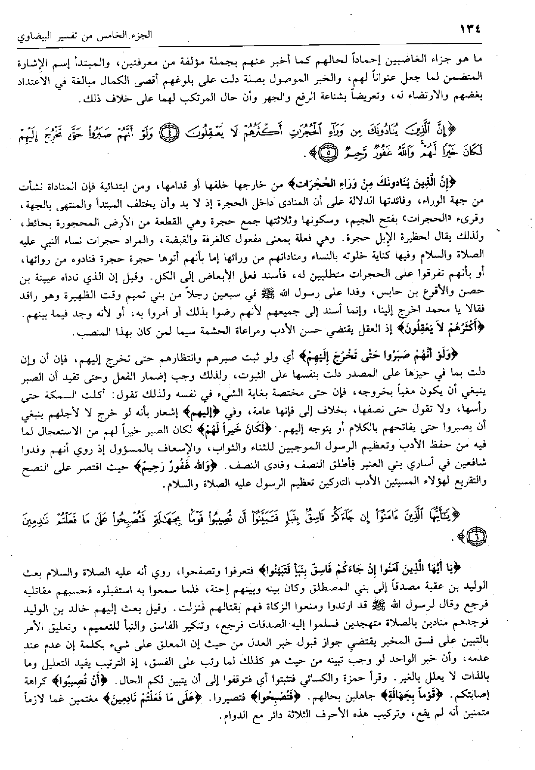 إِنَّ الَّذِينَ يُنادُونَكَ مِنْ وَراءِ الْحُجُراتِ من خارجها خلفها أو قدامها، ومن ابتدائية فإن المناداة نشأت من جهة الوراء، وفائدتها الدلالة على أن المنادي داخل الحجرة إذ لا بد وأن يختلف المبتدأ والمنتهى بالجهة، وقرئ «الحجرات» بفتح الجيم، وسكونها وثلاثتها جمع حجرة وهي القطعة من الأرض المحجورة بحائط، ولذلك يقال لحظيرة الإِبل حجرة. وهي فعلة بمعنى مفعول كالغرفة والقبضة، والمراد حجرات نساء النبي عليه الصلاة والسلام وفيها كناية خلوته بالنساء ومناداتهم من ورائها إما بأنهم أتوها حجرة حجرة فنادوه من ورائها، أو بأنهم تفرقوا على الحجرات متطلبين له، فأسند فعل الأبعاض إلى الكل. وقيل إن الذي ناداه عيينة بن حصن والأقرع بن حابس، وفدا على رسول الله صلّى الله عليه وسلم في سبعين رجلاً من بني تميم وقت الظهيرة وهو راقد فقالا يا محمد اخرج إلينا، وإنما أسند إلى جميعهم لأنهم رضوا بذلك أو أمروا به، أو لأنه وجد فيما بينهم.