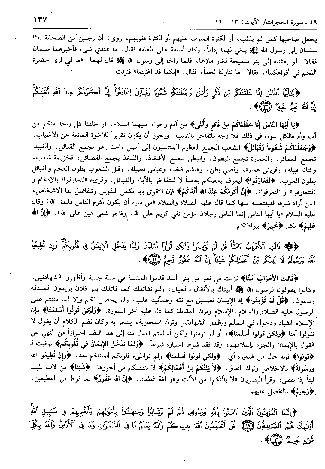 يا أَيُّهَا النَّاسُ إِنَّا خَلَقْناكُمْ مِنْ ذَكَرٍ وَأُنْثى وَجَعَلْناكُمْ شُعُوباً وَقَبائِلَ لِتَعارَفُوا إِنَّ أَكْرَمَكُمْ عِنْدَ اللَّهِ أَتْقاكُمْ إِنَّ اللَّهَ عَلِيمٌ خَبِيرٌ (13)