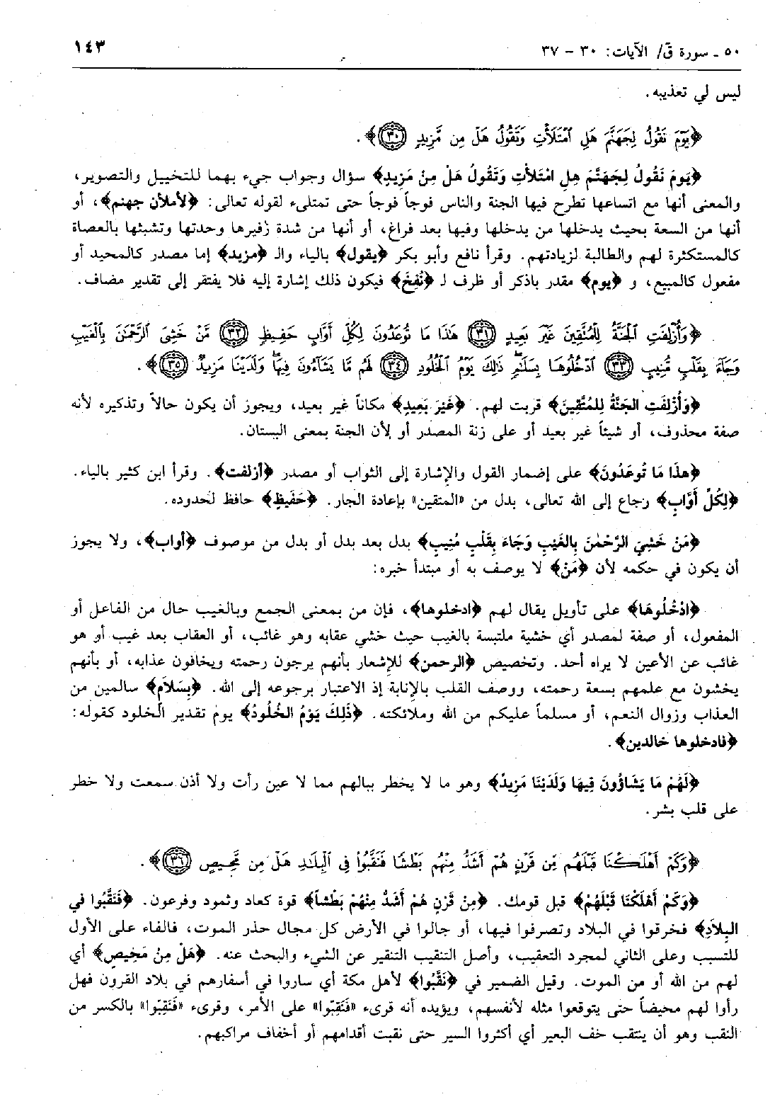 وَأُزْلِفَتِ الْجَنَّةُ لِلْمُتَّقِينَ غَيْرَ بَعِيدٍ (31) هذا ما تُوعَدُونَ لِكُلِّ أَوَّابٍ حَفِيظٍ (32) مَنْ خَشِيَ الرَّحْمنَ بِالْغَيْبِ وَجاءَ بِقَلْبٍ مُنِيبٍ (33) ادْخُلُوها بِسَلامٍ ذلِكَ يَوْمُ الْخُلُودِ (34) لَهُمْ ما يَشاؤُنَ فِيها وَلَدَيْنا مَزِيدٌ (35)