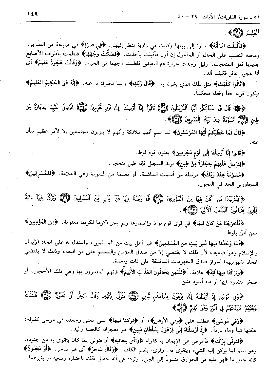 علفتها تبناً وماء بارداً. إِذْ أَرْسَلْناهُ إِلى فِرْعَوْنَ بِسُلْطانٍ مُبِينٍ هو معجزاته كالعصا واليد.