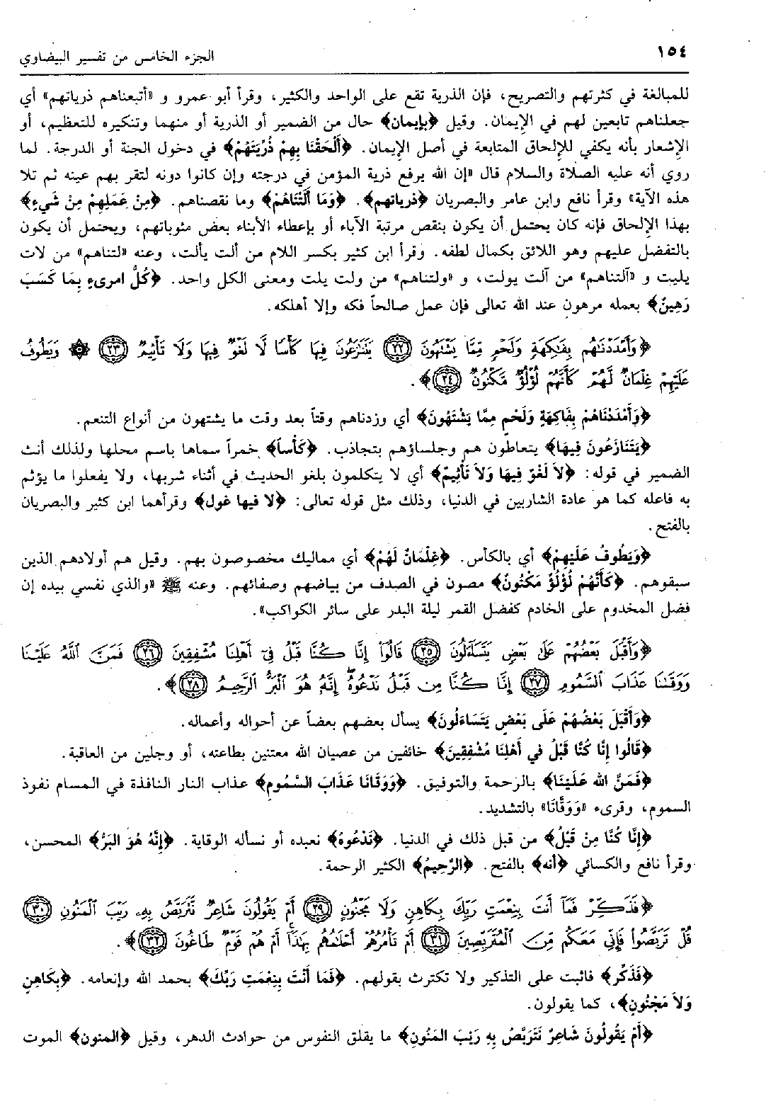 وقرأ نافع وابن عامر والبصريان ذرياتهم. وَما أَلَتْناهُمْ وما نقصناهم. مِنْ عَمَلِهِمْ مِنْ شَيْءٍ بهذا الإِلحاق فإنه كان يحتمل أن يكون بنقص مرتبة الآباء أو بإعطاء الأبناء بعض مثوباتهم، ويحتمل أن يكون بالتفضل عليهم وهو اللائق بكمال لطفه. وقرأ ابن كثير بكسر اللام من ألت يألت، وعنه «لتناهم» من لات يليت و «آلتناهم» من آلت يولت، و «ولتناهم» من ولت يلت ومعنى الكل واحد. كُلُّ امْرِئٍ بِما كَسَبَ رَهِينٌ بعمله مرهون عند الله تعالى فإن عمل صالحاً فكه وإلا أهلكه.