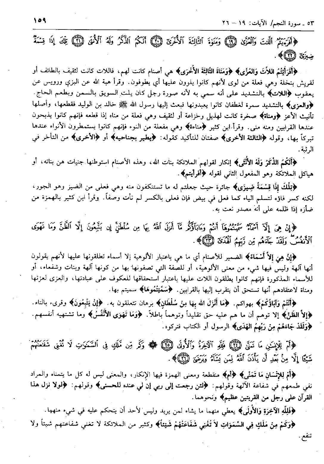 أَفَرَأَيْتُمُ اللاَّتَ وَالْعُزَّى (19) وَمَناةَ الثَّالِثَةَ الْأُخْرى (20) أَلَكُمُ الذَّكَرُ وَلَهُ الْأُنْثى (21) تِلْكَ إِذاً قِسْمَةٌ ضِيزى (22)