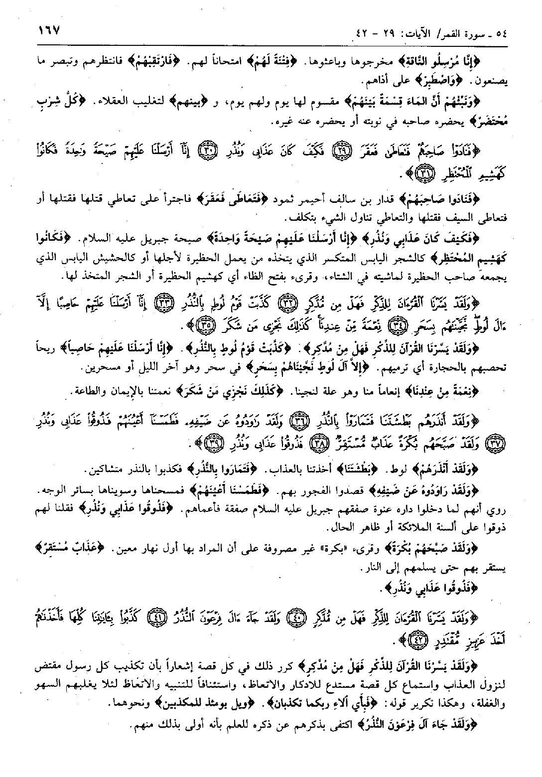 وَلَقَدْ يَسَّرْنَا الْقُرْآنَ لِلذِّكْرِ فَهَلْ مِنْ مُدَّكِرٍ. كَذَّبَتْ قَوْمُ لُوطٍ بِالنُّذُرِ. إِنَّا أَرْسَلْنا عَلَيْهِمْ حاصِباً ريحاً تحصبهم بالحجارة أي ترميهم. إِلَّا آلَ لُوطٍ نَجَّيْناهُمْ بِسَحَرٍ في سحر وهو آخر الليل أو مسحرين.