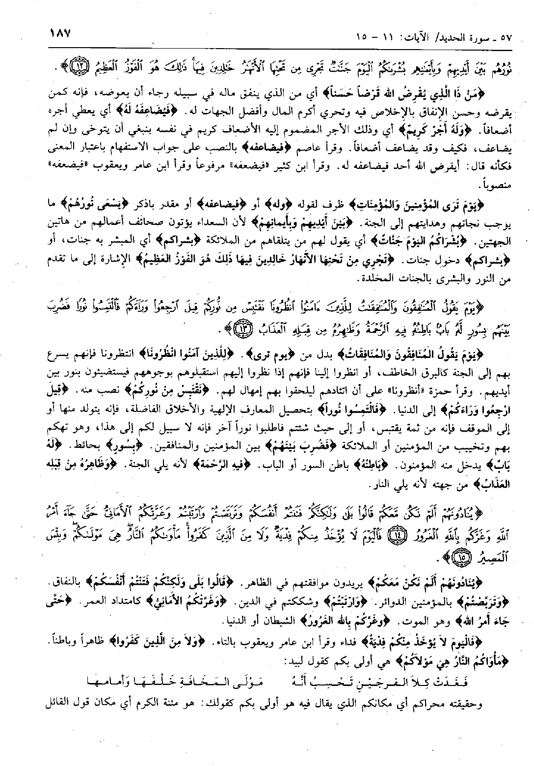 يَوْمَ يَقُولُ الْمُنافِقُونَ وَالْمُنافِقاتُ بدل من يَوْمَ تَرَى. لِلَّذِينَ آمَنُوا انْظُرُونا انتظرونا فإنهم يسرع بهم إلى الجنة كالبرق الخاطف، أو انظروا إلينا فإنهم إذا نظروا إليهم استقبلوهم بوجوههم فيستضيئون بنور بين أيديهم. وقرأ حمزة «أنظرونا» على أن اتئادهم ليلحقوا بهم إمهال لهم. نَقْتَبِسْ مِنْ نُورِكُمْ نصب منه. قِيلَ ارْجِعُوا وَراءَكُمْ إلى الدنيا. فَالْتَمِسُوا نُوراً بتحصيل المعارف الإلهية والأخلاق الفاضلة، فإنه يتولد منها أو إلى الموقف فإنه من ثمة يقتبس، أو إلى حيث شئتم فاطلبوا نوراً آخر فإنه لا سبيل لكم إلى هذا، وهو تهكم بهم وتخييب من المؤمنين أو الملائكة فَضُرِبَ بَيْنَهُمْ بين المؤمنين والمنافقين. بِسُورٍ بحائط. لَهُ بابٌ يدخل منه المؤمنون. باطِنُهُ باطن السور أو الباب. فِيهِ الرَّحْمَةُ لأنه يلي الجنة. وَظاهِرُهُ مِنْ قِبَلِهِ الْعَذابُ من جهته لأنه يلي النار.