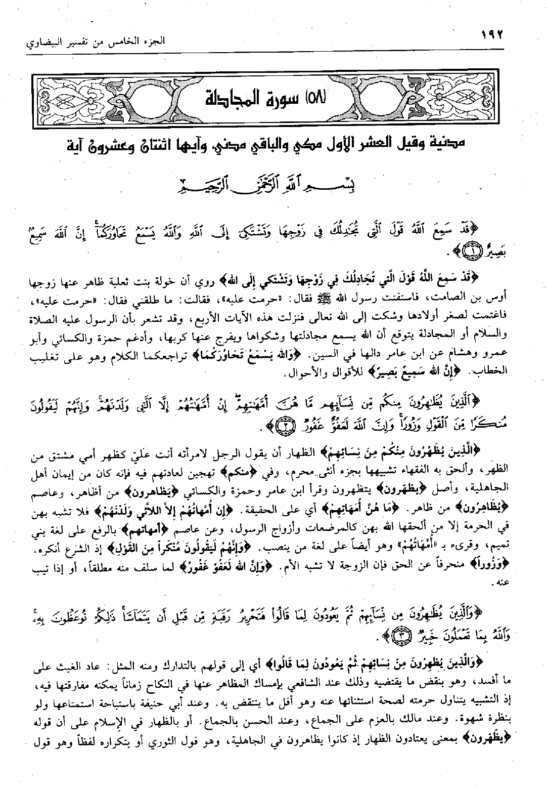 قَدْ سَمِعَ اللَّهُ قَوْلَ الَّتِي تُجادِلُكَ فِي زَوْجِها وَتَشْتَكِي إِلَى اللَّهِ وَاللَّهُ يَسْمَعُ تَحاوُرَكُما إِنَّ اللَّهَ سَمِيعٌ بَصِيرٌ (1)
