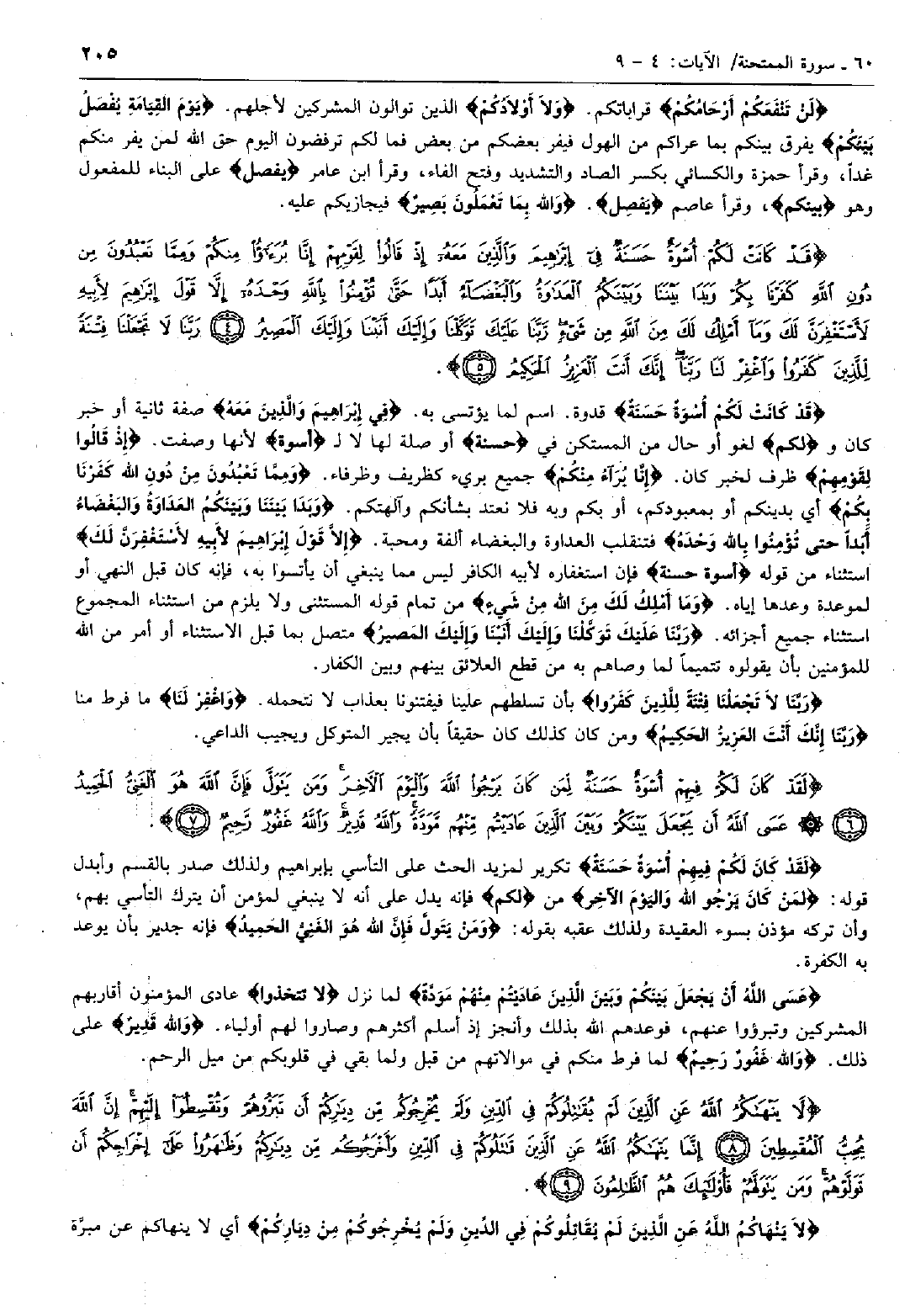 قَدْ كانَتْ لَكُمْ أُسْوَةٌ حَسَنَةٌ فِي إِبْراهِيمَ وَالَّذِينَ مَعَهُ إِذْ قالُوا لِقَوْمِهِمْ إِنَّا بُرَآؤُا مِنْكُمْ وَمِمَّا تَعْبُدُونَ مِنْ دُونِ اللَّهِ كَفَرْنا بِكُمْ وَبَدا بَيْنَنا وَبَيْنَكُمُ الْعَداوَةُ وَالْبَغْضاءُ أَبَداً حَتَّى تُؤْمِنُوا بِاللَّهِ وَحْدَهُ إِلاَّ قَوْلَ إِبْراهِيمَ لِأَبِيهِ لَأَسْتَغْفِرَنَّ لَكَ وَما أَمْلِكُ لَكَ مِنَ اللَّهِ مِنْ شَيْءٍ رَبَّنا عَلَيْكَ تَوَكَّلْنا وَإِلَيْكَ أَنَبْنا وَإِلَيْكَ الْمَصِيرُ (4) رَبَّنا لاَ تَجْعَلْنا فِتْنَةً لِلَّذِينَ كَفَرُوا وَاغْفِرْ لَنا رَبَّنا إِنَّكَ أَنْتَ الْعَزِيزُ الْحَكِيمُ (5)