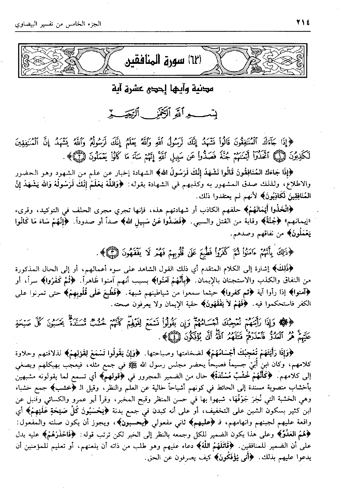 إِذا جاءَكَ الْمُنافِقُونَ قالُوا نَشْهَدُ إِنَّكَ لَرَسُولُ اللَّهِ وَاللَّهُ يَعْلَمُ إِنَّكَ لَرَسُولُهُ وَاللَّهُ يَشْهَدُ إِنَّ الْمُنافِقِينَ لَكاذِبُونَ (1) اتَّخَذُوا أَيْمانَهُمْ جُنَّةً فَصَدُّوا عَنْ سَبِيلِ اللَّهِ إِنَّهُمْ ساءَ مَا كانُوا يَعْمَلُونَ (2)