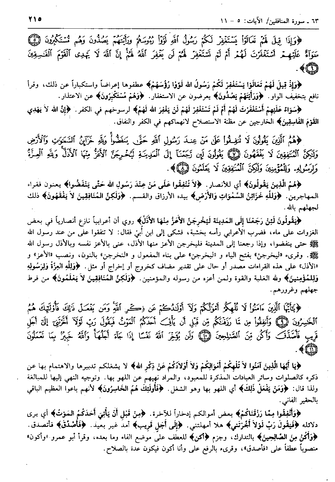 يا أَيُّهَا الَّذِينَ آمَنُوا لاَ تُلْهِكُمْ أَمْوالُكُمْ وَلا أَوْلادُكُمْ عَنْ ذِكْرِ اللَّهِ وَمَنْ يَفْعَلْ ذلِكَ فَأُولئِكَ هُمُ الْخاسِرُونَ (9) وَأَنْفِقُوا مِنْ ما رَزَقْناكُمْ مِنْ قَبْلِ أَنْ يَأْتِيَ أَحَدَكُمُ الْمَوْتُ فَيَقُولَ رَبِّ لَوْلا أَخَّرْتَنِي إِلى أَجَلٍ قَرِيبٍ فَأَصَّدَّقَ وَأَكُنْ مِنَ الصَّالِحِينَ (10) وَلَنْ يُؤَخِّرَ اللَّهُ نَفْساً إِذا جاءَ أَجَلُها وَاللَّهُ خَبِيرٌ بِما تَعْمَلُونَ (11)