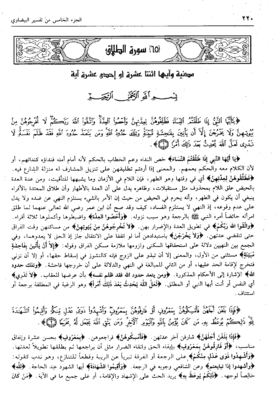 يا أَيُّهَا النَّبِيُّ إِذا طَلَّقْتُمُ النِّساءَ فَطَلِّقُوهُنَّ لِعِدَّتِهِنَّ وَأَحْصُوا الْعِدَّةَ وَاتَّقُوا اللَّهَ رَبَّكُمْ لاَ تُخْرِجُوهُنَّ مِنْ بُيُوتِهِنَّ وَلا يَخْرُجْنَ إِلاَّ أَنْ يَأْتِينَ بِفاحِشَةٍ مُبَيِّنَةٍ وَتِلْكَ حُدُودُ اللَّهِ وَمَنْ يَتَعَدَّ حُدُودَ اللَّهِ فَقَدْ ظَلَمَ نَفْسَهُ لا تَدْرِي لَعَلَّ اللَّهَ يُحْدِثُ بَعْدَ ذلِكَ أَمْراً (1)