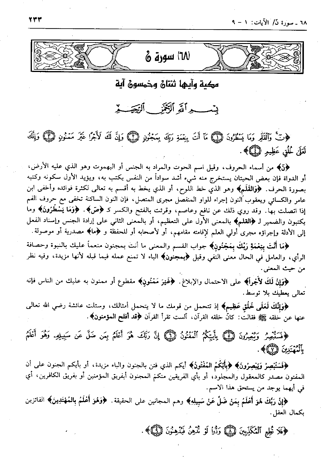 ن وَالْقَلَمِ وَما يَسْطُرُونَ (1) مَا أَنْتَ بِنِعْمَةِ رَبِّكَ بِمَجْنُونٍ (2) وَإِنَّ لَكَ لَأَجْراً غَيْرَ مَمْنُونٍ (3) وَإِنَّكَ لَعَلى خُلُقٍ عَظِيمٍ (4)