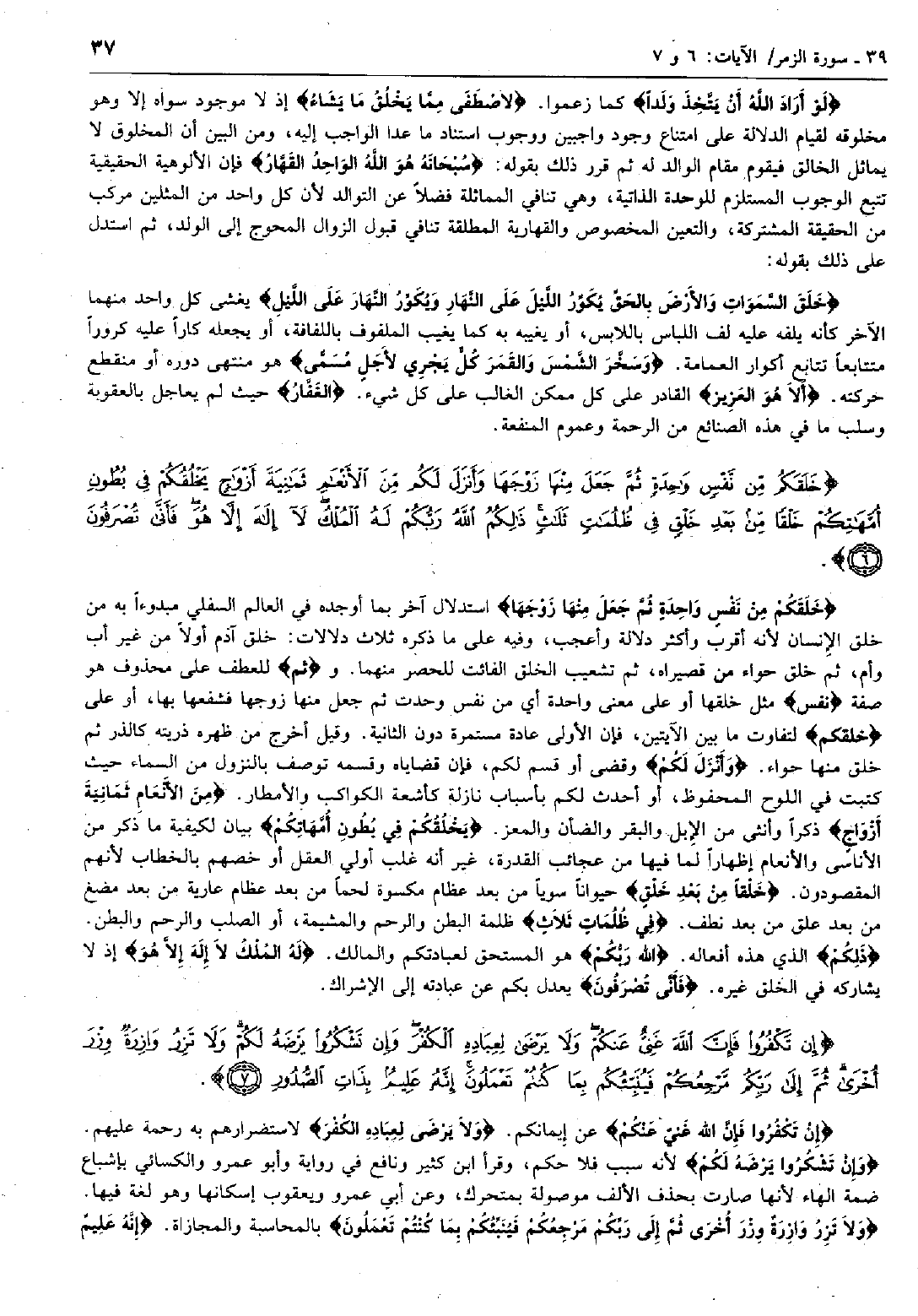 إِنْ تَكْفُرُوا فَإِنَّ اللَّهَ غَنِيٌّ عَنْكُمْ وَلا يَرْضى لِعِبادِهِ الْكُفْرَ وَإِنْ تَشْكُرُوا يَرْضَهُ لَكُمْ وَلا تَزِرُ وازِرَةٌ وِزْرَ أُخْرى ثُمَّ إِلى رَبِّكُمْ مَرْجِعُكُمْ فَيُنَبِّئُكُمْ بِما كُنْتُمْ تَعْمَلُونَ إِنَّهُ عَلِيمٌ بِذاتِ الصُّدُورِ (7)