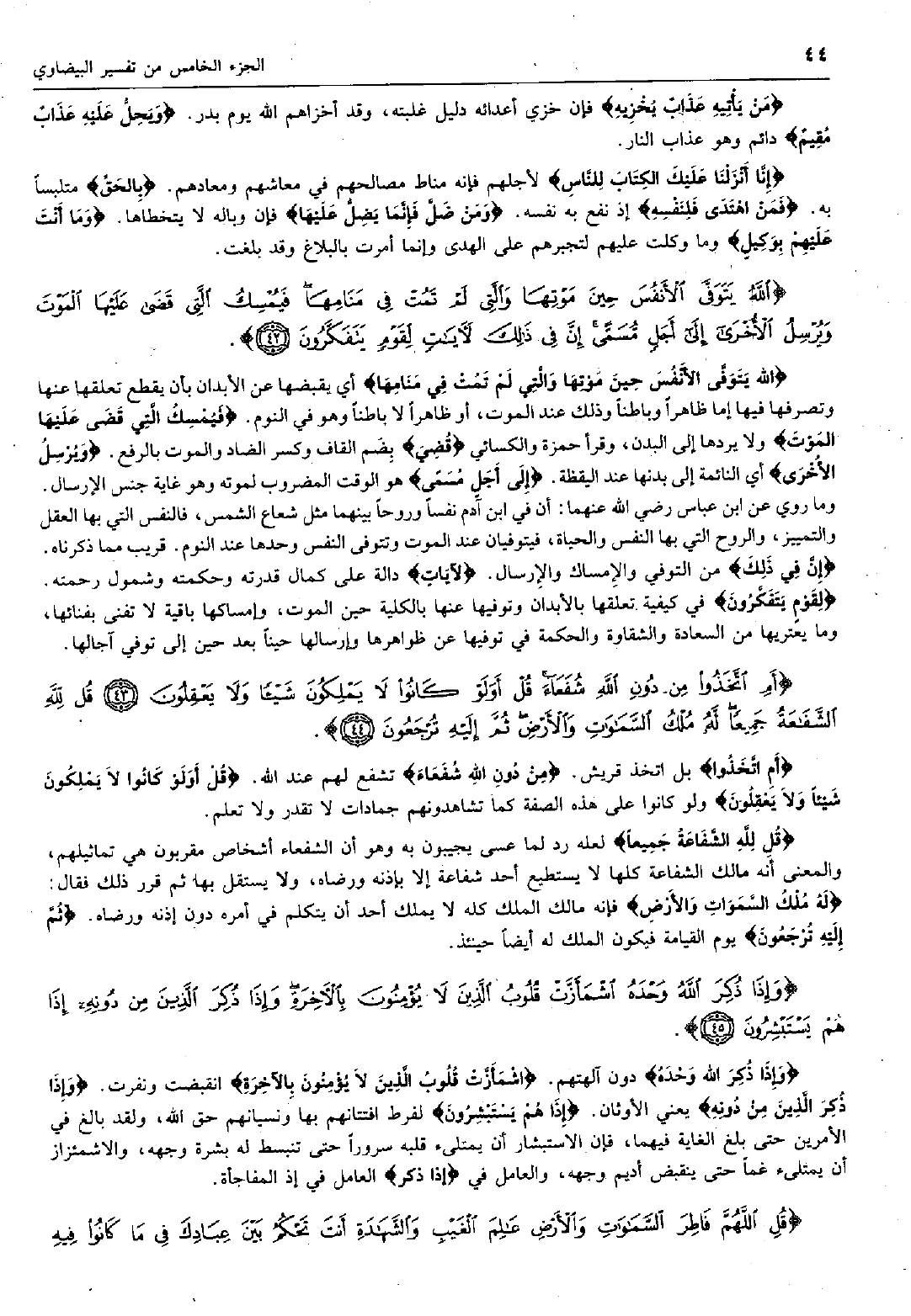 اللَّهُ يَتَوَفَّى الْأَنْفُسَ حِينَ مَوْتِها وَالَّتِي لَمْ تَمُتْ فِي مَنامِها أي يقبضها عن الأبدان بأن يقطع تعلقها عنها وتصرفها فيها إما ظاهراً وباطناً وذلك عند الموت، أو ظاهراً لا باطناً وهو في النوم. فَيُمْسِكُ الَّتِي قَضى عَلَيْهَا الْمَوْتَ ولا يردها إلى البدن، وقرأ حمزة والكسائي قَضى بِضَم القاف وكسر الضاد والموت بالرفع. وَيُرْسِلُ الْأُخْرى أي النائمة إلى بدنها عند اليقظة. إِلى أَجَلٍ مُسَمًّى هو الوقت المضروب لموته وهو غاية جنس الإرسال.