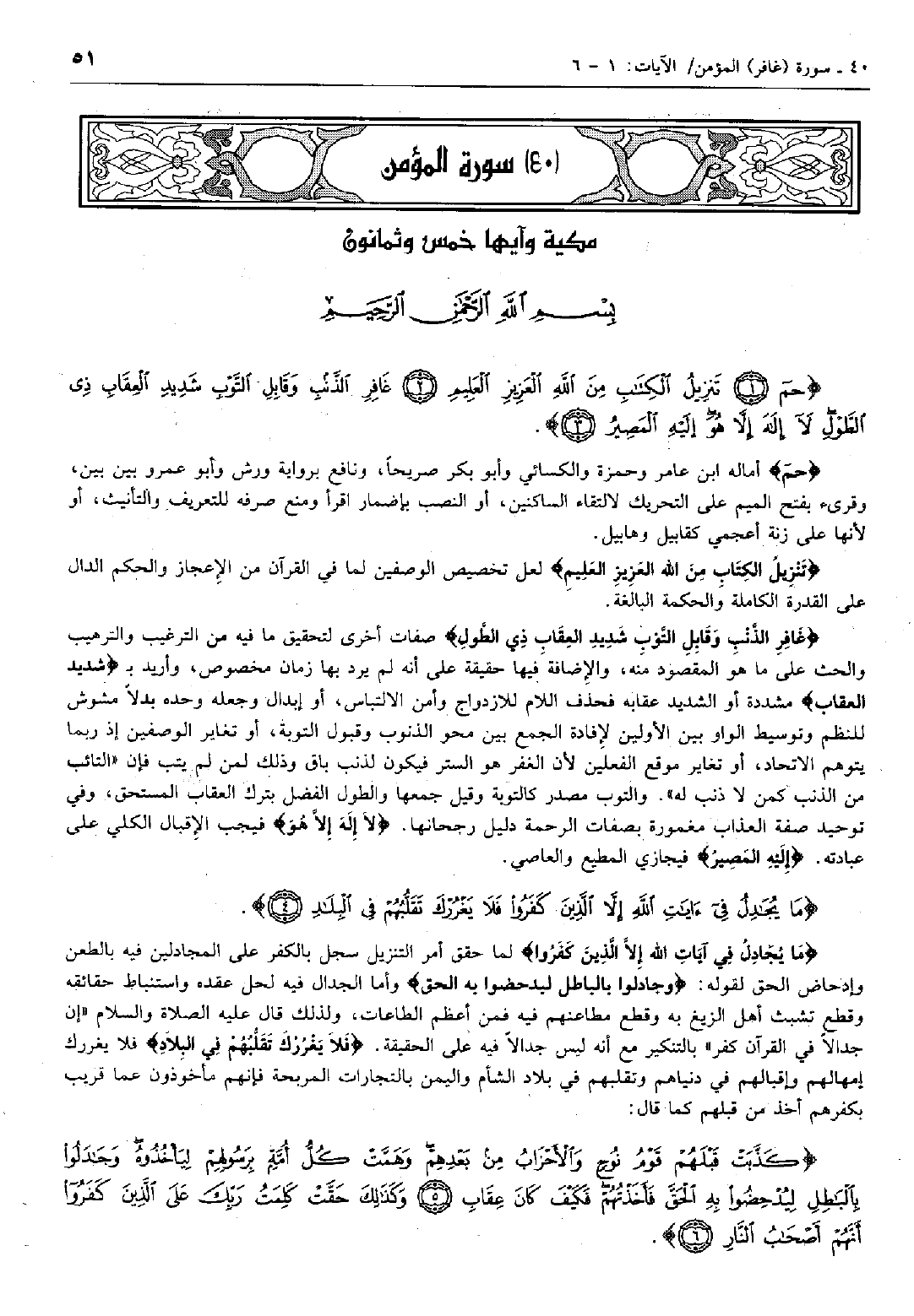 حم (1) تَنْزِيلُ الْكِتابِ مِنَ اللَّهِ الْعَزِيزِ الْعَلِيمِ (2) غافِرِ الذَّنْبِ وَقابِلِ التَّوْبِ شَدِيدِ الْعِقابِ ذِي الطَّوْلِ لا إِلهَ إِلاَّ هُوَ إِلَيْهِ الْمَصِيرُ (3)