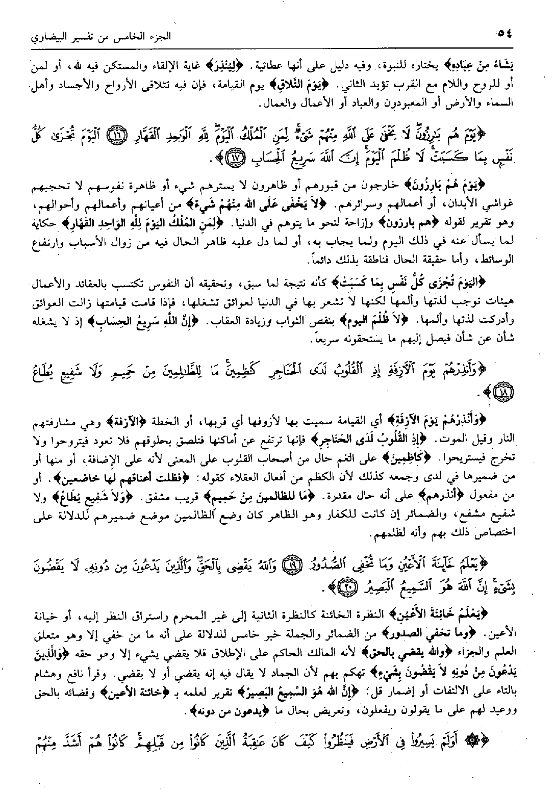 يَوْمَ هُمْ بارِزُونَ خارجون من قبورهم أو ظاهرون لا يسترهم شيء أو ظاهرة نفوسهم لا تحجبهم غواشي الأبدان، أو أعمالهم وسرائرهم. لاَ يَخْفى عَلَى اللَّهِ مِنْهُمْ شَيْءٌ من أعيانهم وأعمالهم وأحوالهم، وهو تقرير لقوله هُمْ بارِزُونَ وإزاحة لنحو ما يتوهم في الدنيا. لِمَنِ الْمُلْكُ الْيَوْمَ لِلَّهِ الْواحِدِ الْقَهَّارِ حكاية لما يسأل عنه في ذلك اليوم ولما يجاب به، أو لما دل عليه ظاهر الحال فيه من زوال الأسباب وارتفاع الوسائط، وأما حقيقة الحال فناطقة بذلك دائماً.