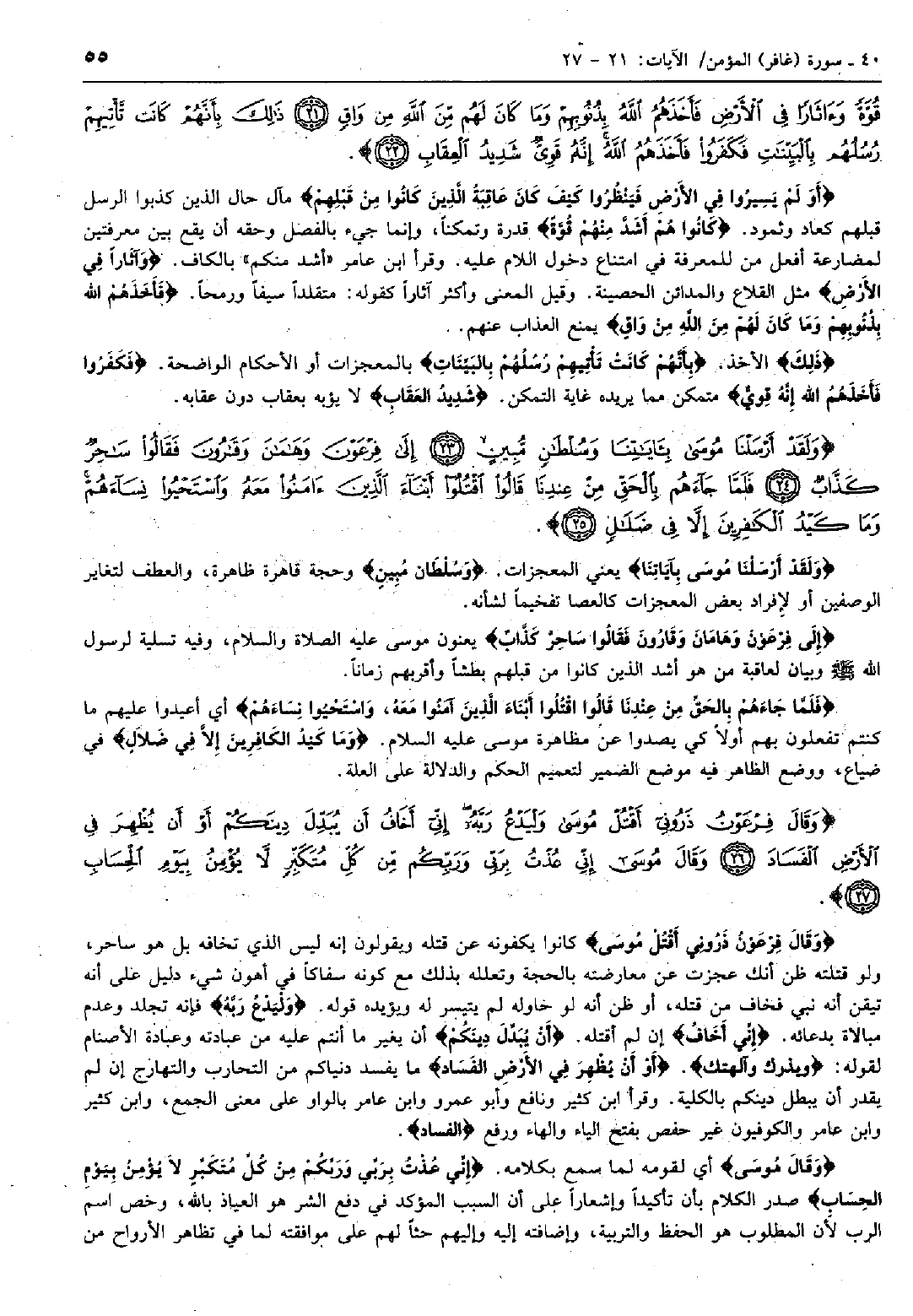 وَلَقَدْ أَرْسَلْنا مُوسى بِآياتِنا وَسُلْطانٍ مُبِينٍ (23) إِلى فِرْعَوْنَ وَهامانَ وَقارُونَ فَقالُوا ساحِرٌ كَذَّابٌ (24) فَلَمَّا جاءَهُمْ بِالْحَقِّ مِنْ عِنْدِنا قالُوا اقْتُلُوا أَبْناءَ الَّذِينَ آمَنُوا مَعَهُ وَاسْتَحْيُوا نِساءَهُمْ وَما كَيْدُ الْكافِرِينَ إِلاَّ فِي ضَلالٍ (25)
