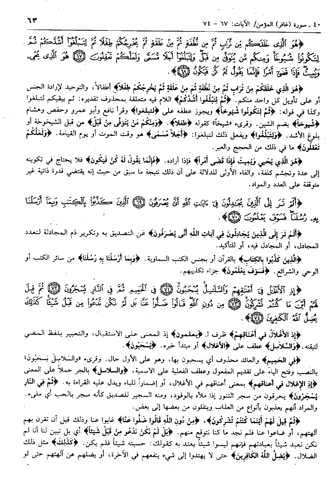 هُوَ الَّذِي خَلَقَكُمْ مِنْ تُرابٍ ثُمَّ مِنْ نُطْفَةٍ ثُمَّ مِنْ عَلَقَةٍ ثُمَّ يُخْرِجُكُمْ طِفْلاً ثُمَّ لِتَبْلُغُوا أَشُدَّكُمْ ثُمَّ لِتَكُونُوا شُيُوخاً وَمِنْكُمْ مَنْ يُتَوَفَّى مِنْ قَبْلُ وَلِتَبْلُغُوا أَجَلاً مُسَمًّى وَلَعَلَّكُمْ تَعْقِلُونَ (67) هُوَ الَّذِي يُحْيِي وَيُمِيتُ فَإِذا قَضى أَمْراً فَإِنَّما يَقُولُ لَهُ كُنْ فَيَكُونُ (68)
