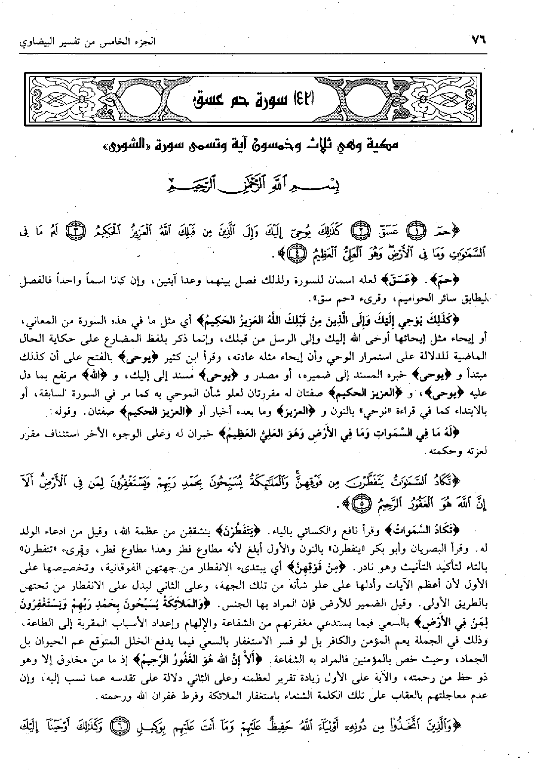 حم (1) عسق (2) كَذلِكَ يُوحِي إِلَيْكَ وَإِلَى الَّذِينَ مِنْ قَبْلِكَ اللَّهُ الْعَزِيزُ الْحَكِيمُ (3) لَهُ ما فِي السَّماواتِ وَما فِي الْأَرْضِ وَهُوَ الْعَلِيُّ الْعَظِيمُ (4)