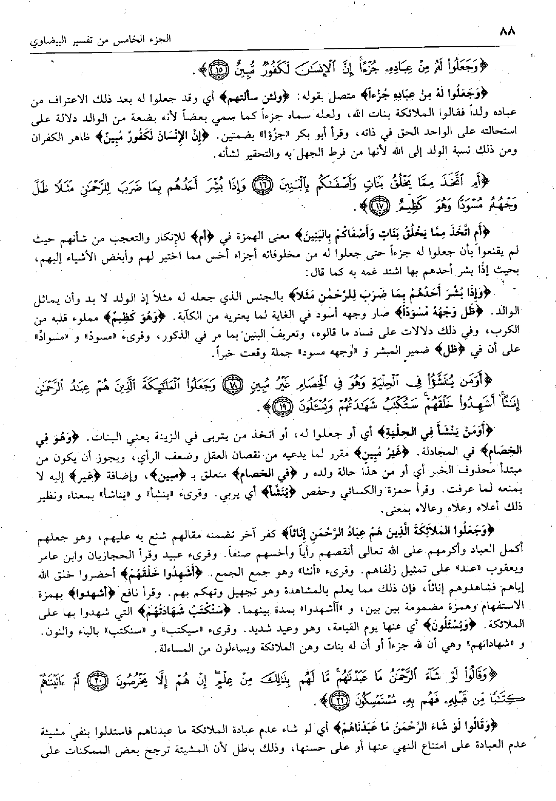 وَجَعَلُوا لَهُ مِنْ عِبادِهِ جُزْءاً متصل بقوله: وَلَئِنْ سَأَلْتَهُمْ أي وقد جعلوا له بعد ذلك الاعتراف من عباده ولداً فقالوا الملائكة بنات الله، ولعله سماه جزءاً كما سمي بعضاً لأنه بضعة من الوالد دلالة على استحالته على الواحد الحق في ذاته، وقرأ أبو بكر «جزءوا» بضمتين. إِنَّ الْإِنْسانَ لَكَفُورٌ مُبِينٌ ظاهر الكفران ومن ذلك نسبة الولد إلى الله لأنها من فرط الجهل به والتحقير لشأنه.