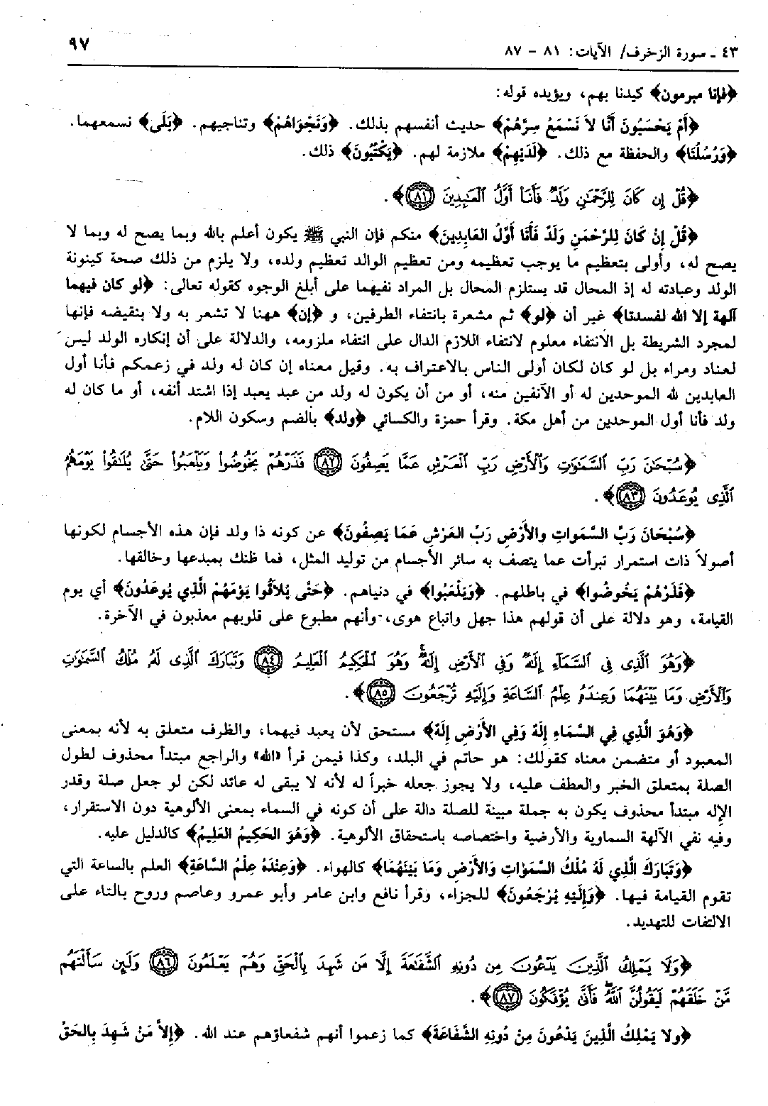وَلا يَمْلِكُ الَّذِينَ يَدْعُونَ مِنْ دُونِهِ الشَّفاعَةَ إِلاَّ مَنْ شَهِدَ بِالْحَقِّ وَهُمْ يَعْلَمُونَ (86) وَلَئِنْ سَأَلْتَهُمْ مَنْ خَلَقَهُمْ لَيَقُولُنَّ اللَّهُ فَأَنَّى يُؤْفَكُونَ (87)