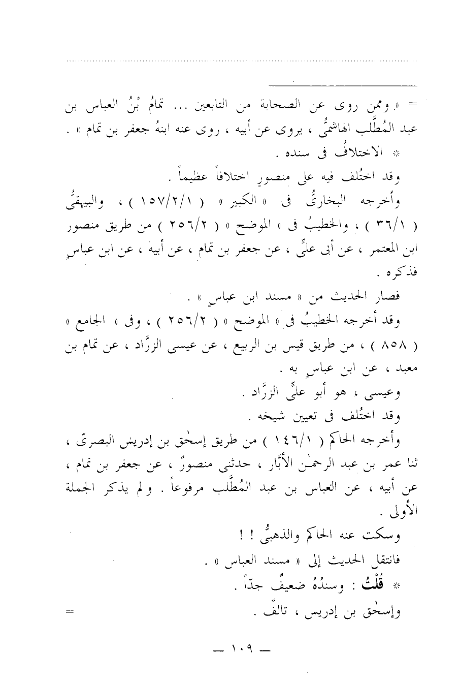 = "وممن روى عن الصحابة من التابعين ... تمامُ بْنُ العباس بن عبد المُطَّلب الهاشمىُّ، يروى عن أبيه، روى عنه ابنهُ جعفر بن تمام".