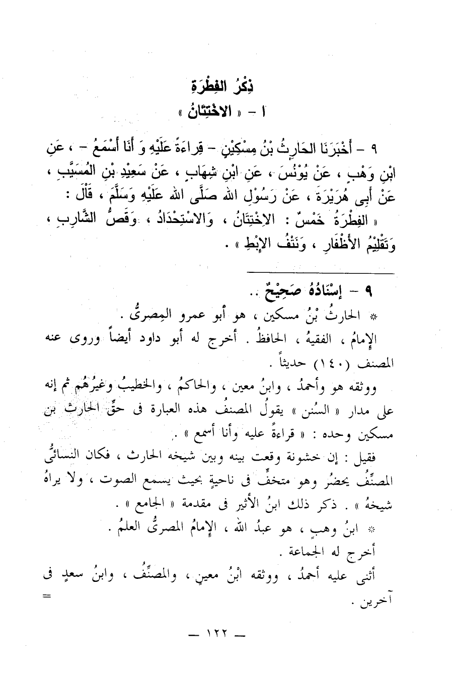 9 - أَخْبَرَنَا الْحَارِثُ بْنُ مِسْكِينٍ قِرَاءَةً عَلَيْهِ وَأَنَا أَسْمَعُ عَنِ ابْنِ وَهْبٍ عَنْ يُونُسَ عَنِ ابْنِ شِهَابٍ عَنْ سَعِيدِ بْنِ الْمُسَيَّبِ عَنْ أَبِى هُرَيْرَةَ عَنْ رَسُولِ اللَّهِ -صلى الله عليه وسلم- قَالَ «الْفِطْرَةُ خَمْسٌ الاِخْتِتَانُ وَالاِسْتِحْدَادُ وَقَصُّ الشَّارِبِ وَتَقْلِيمُ الأَظْفَارِ وَنَتْفُ الإِبْطِ».