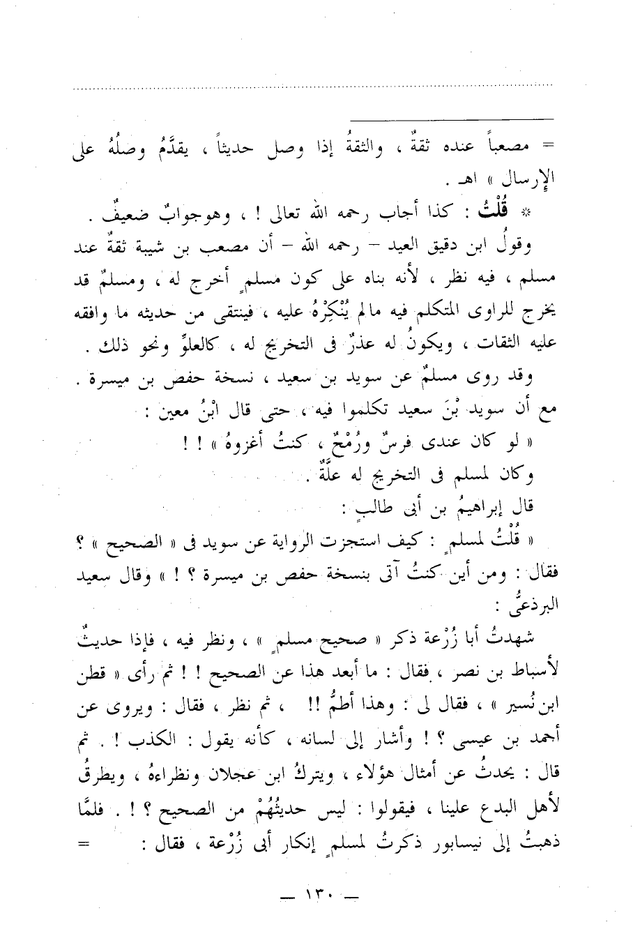 وقولُ ابن دقيق العيد - رحمه الله - أن مصعب بن شيبة ثقةٌ عند مسلم، فيه نظر؛ لأنه بناه عام كون مسلمٍ أخرج له، ومسلمٌ قد يخرج للراوى المتكلم فيه ما لم يُنْكِرهُ عليه، فينتقى من حديثه ما وافقه عليه الثقات، ويكونُ له عذرٌ في التخريج له، كالعلوِّ ونحو ذلك.