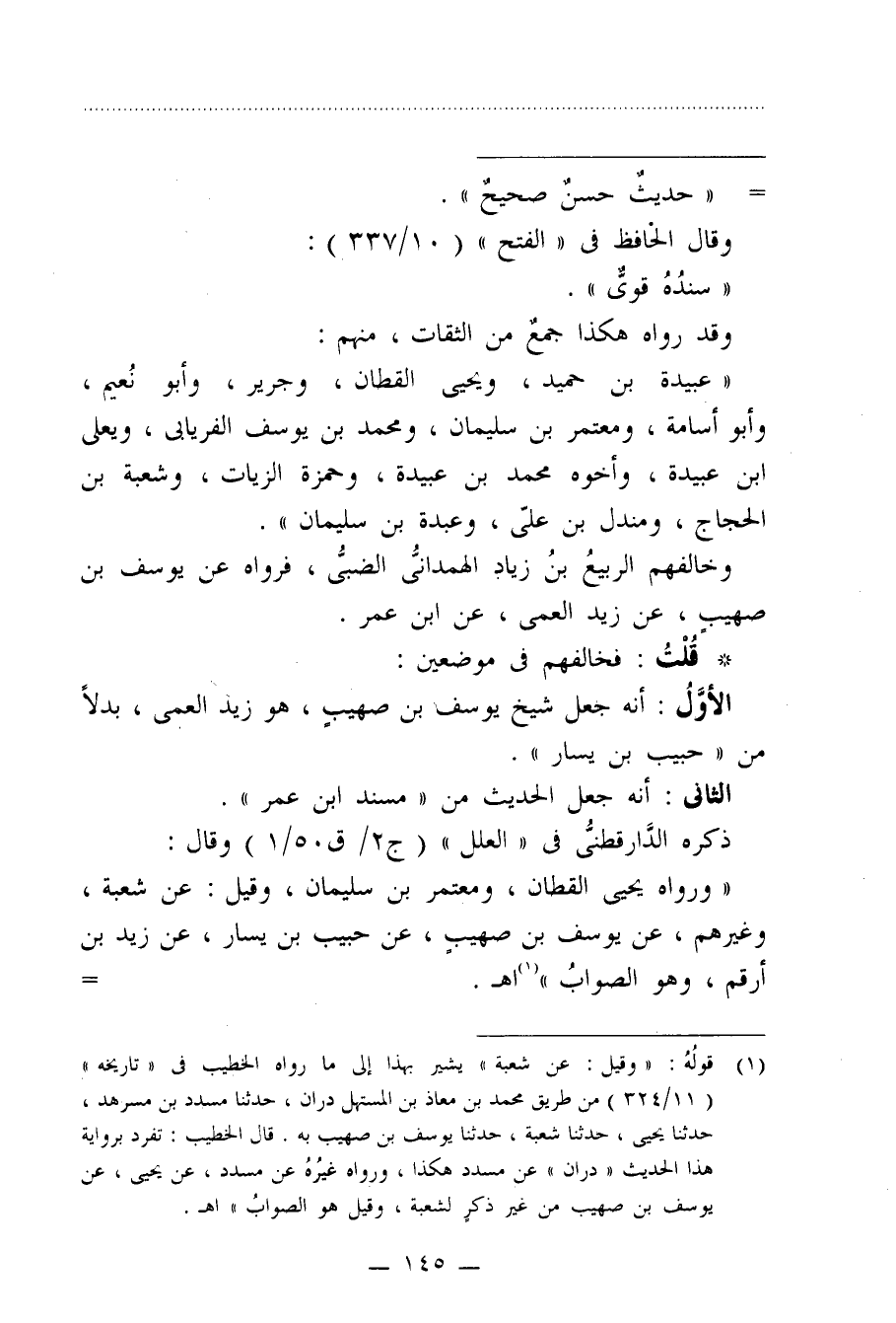 (¬1) قولُهُ: "وقيل: عن شعبة" يشير بهذا إلى ما رواه الخطيب في "تاريخه" (11/ 324) من طريق محمد بن معاذ بن المستهل دران، حدثنا مسدد بن مسرهد، حدثا يحيى، حدثنا شعبة، حدثنا يوسف بن صهيب به. قال الخطيب: تفرد برواية هذا الحديث "دران" عن مسدد هكذا، ورواه غيرُهُ عن مسدد، عن يحيى، عن يوسف بن صهيب من غير ذكرٍ لشعبة، وقيل هو الصوابُ" اهـ.