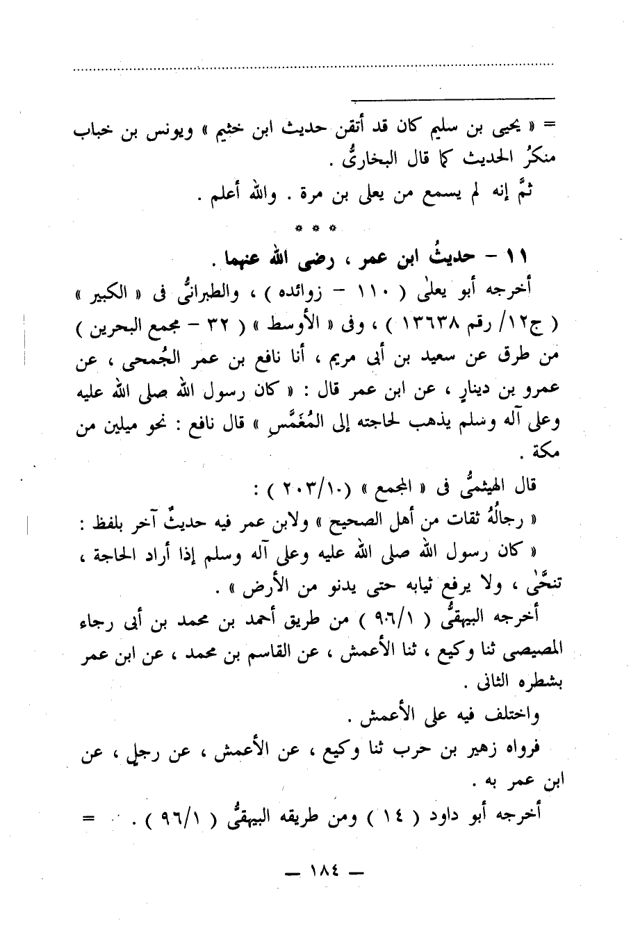 أخرجه أبو يعلى (110 - زوائده)، والطبراني في "الكبير" (ج 12/ رقم 13638)، وفي "الأوسط" (32 - مجمع البحرين) من طرق عن سعيد بن أبي مريم، أنا نافع بن عمر الجُمحي، عن عمرو بن دينارٍ، عن ابن عمر قال: "كان رسول الله صلى الله عليه وعلى آله وسلم يذهب لحاجته إلى المُغَمَّسِ" قال نافع: نحو ميلين من مكة.