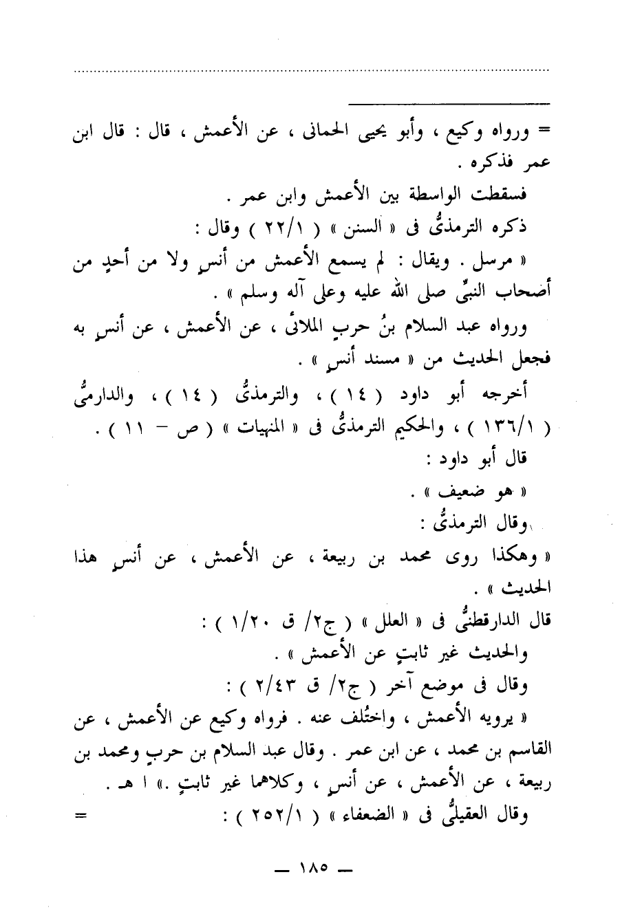"يرويه الأعمش، واختُلف عنه. فرواه وكيع عن الأعمش، عن القاسم بن محمد، عن ابن عمر. وقال عبد السلام بن حربٍ ومحمد بن ربيعة، عن الأعمش، عن أنسٍ، وكلاهما غير ثابتٍ." اهـ.