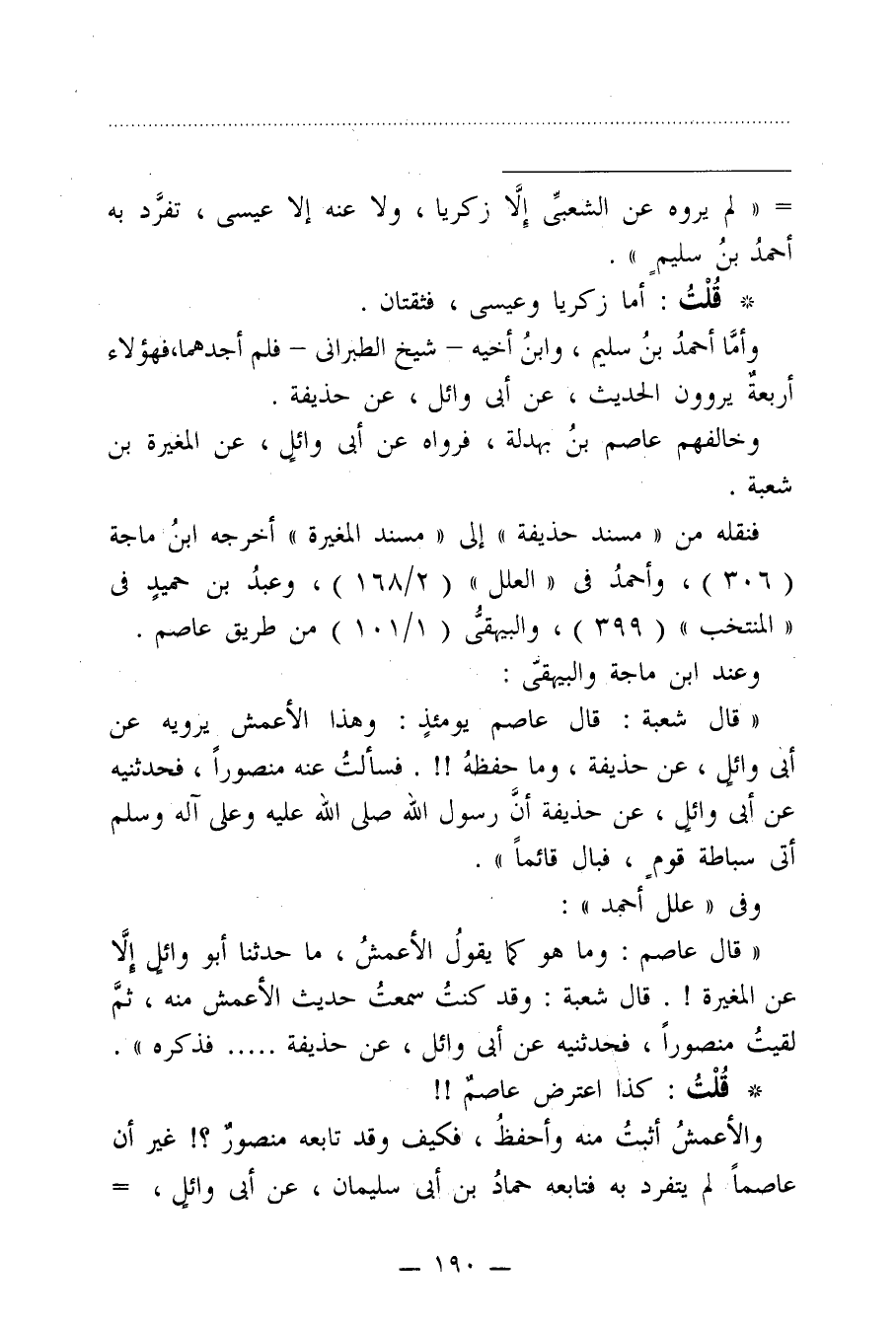 "قال شعبة: قال عاصم يومئذٍ: وهذا الأعمش يرويه عن أبي وائلٍ، عن حذيفة، وما حفظهُ!!. فسألتُ عنه منصورًا، فحدثنيه عن أبي وائلٍ، عن حذيفة أنَّ رسول الله صلى الله عليه وعلى آله وسلم أتى سباطة قومٍ، فبال قائمًا".