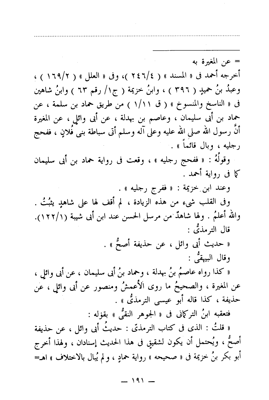 "قلتُ: الذي في كتاب الترمذيّ: حديثُ أبي وائل، عن حذيفة أصحُّ، ويُحتمل أن يكون لشقيقٍ في هذا الحديث إسنادان، ولهذا أخرج أبو بكر بنُ خزيمة في "صحيحه" رواية حمادٍ، ولم يُبال بالاختلاف" اهـ =