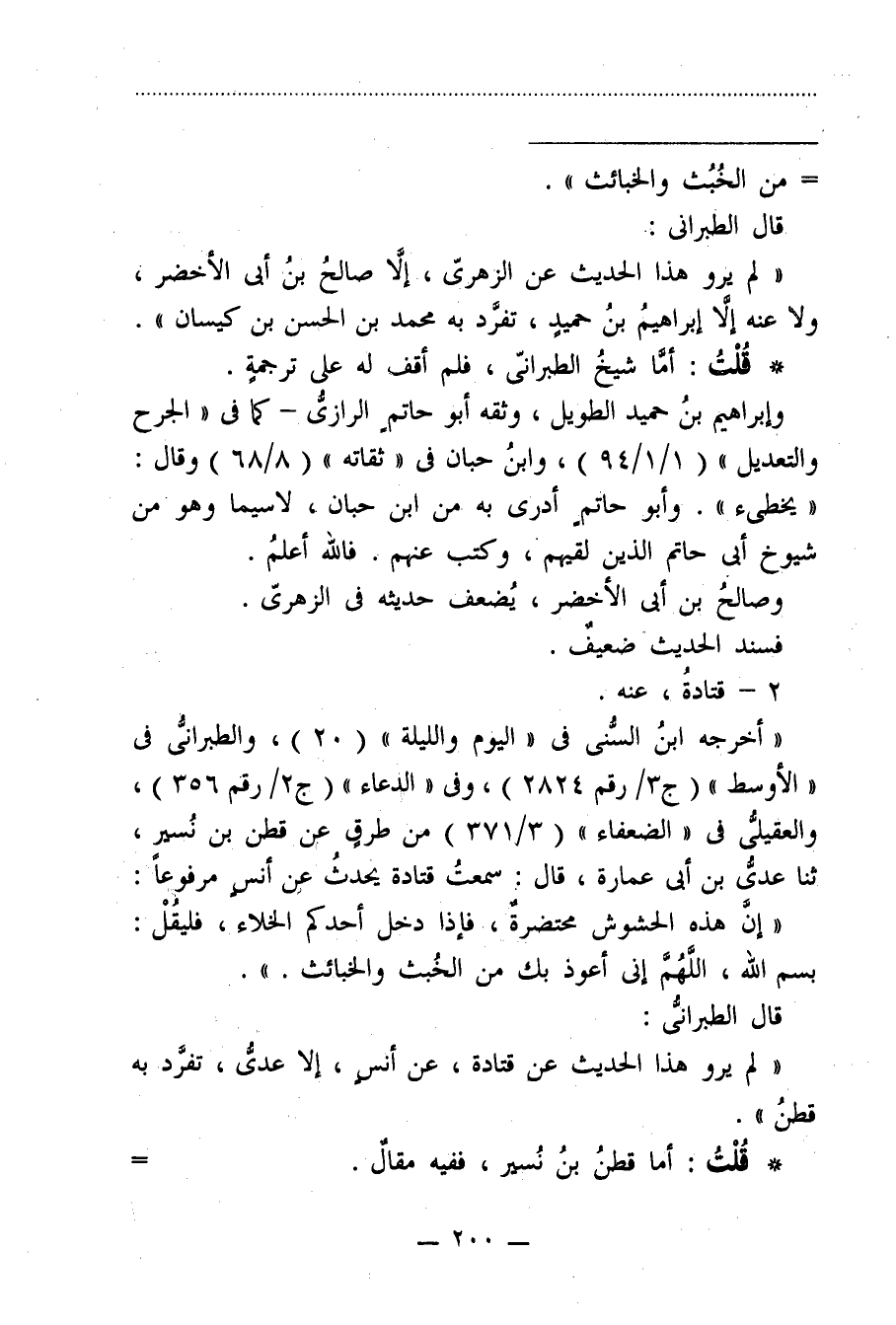 "أخرجه ابنُ السُّني في "اليوم والليلة" (20)، والطبرانيُّ في "الأوسط" (ج 3 / رقم 2824)، وفي "الدعاء" (ج 2 / رقم 356)، والعقيليُّ في "الضعفاء" (3/ 371) من طرقٍ عن قطن بن نُسير، ثنا عديُّ بن أبي عمارة، قال: سمعتُ قتادة يحدثُ عن أنسٍ مرفوعًا: "إنَّ هذه الحشوش محتضرةٌ, فإذا دخل أحدكم الخلاء، فليقُلْ: بسم الله، اللَّهُمَّ إني أعوذ بك من الخُبث والخبائث.".