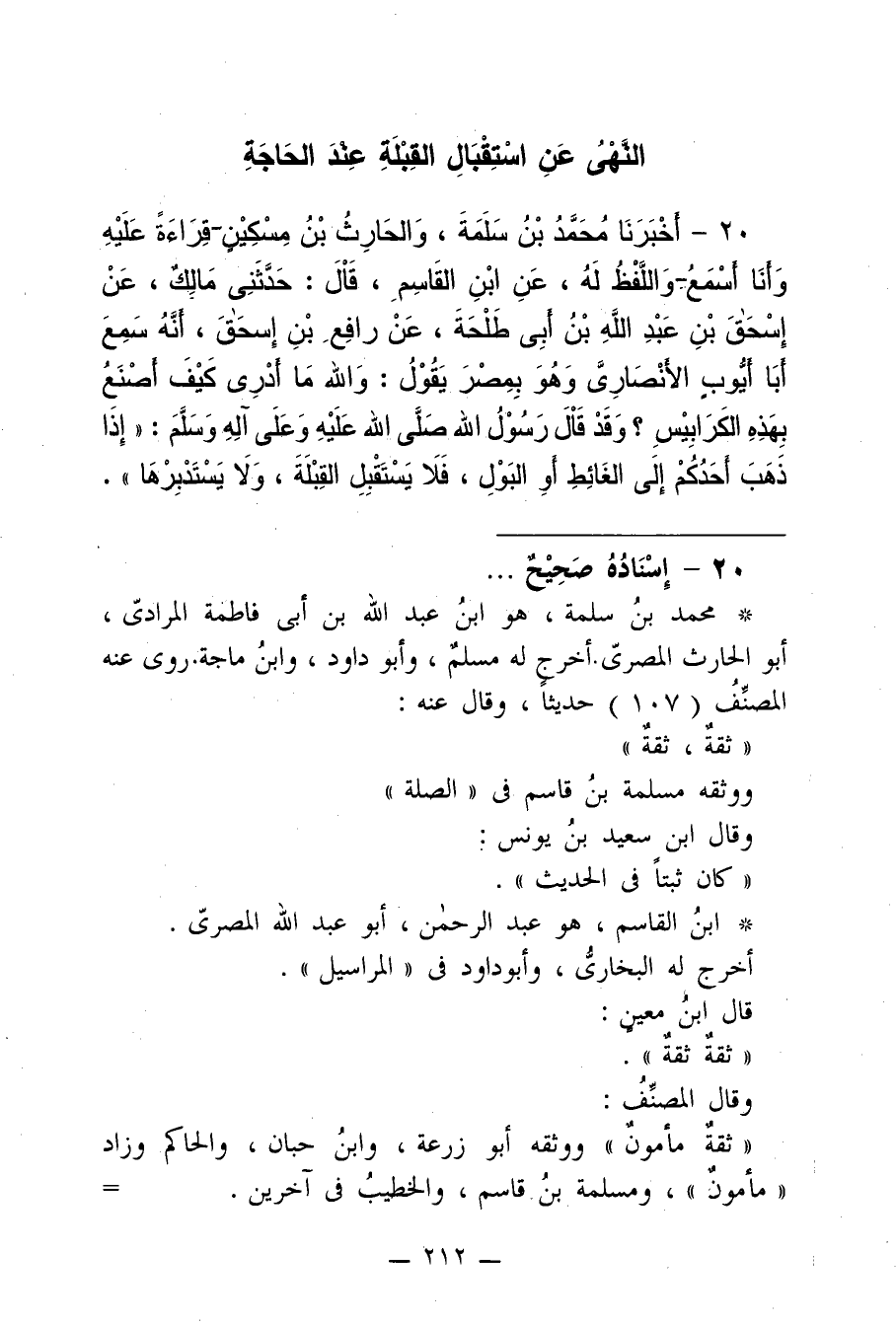 20 - أَخْبَرَنَا مُحَمَّدُ بْنُ سَلَمَةَ وَالْحَارِثُ بْنُ مِسْكِينٍ قِرَاءَةً عَلَيْهِ وَأَنَا أَسْمَعُ وَاللَّفْظُ لَهُ عَنِ ابْنِ الْقَاسِمِ قَالَ حَدَّثَنِى مَالِكٌ عَنْ إِسْحَاقَ بْنِ عَبْدِ اللَّهِ بْنِ أَبِى طَلْحَةَ عَنْ رَافِعِ بْنِ إِسْحَاقَ أَنَّهُ سَمِعَ أَبَا أَيُّوبَ الأَنْصَارِىَّ وَهُوَ بِمِصْرَ يَقُولُ وَاللَّهِ مَا أَدْرِى كَيْفَ أَصْنَعُ بِهَذِهِ الْكَرَايِيسِ وَقَدْ قَالَ رَسُولُ اللَّهِ -صلى الله عليه وسلم- «إِذَا ذَهَبَ أَحَدُكُمْ إِلَى الْغَائِطِ أَوِ الْبَوْلِ فَلاَ يَسْتَقْبِلِ الْقِبْلَةَ وَلاَ يَسْتَدْبِرْهَا».